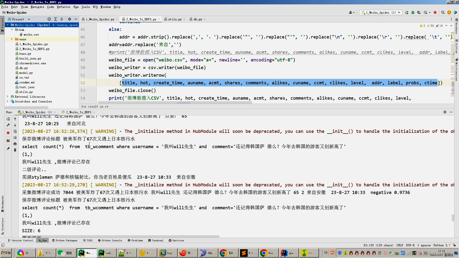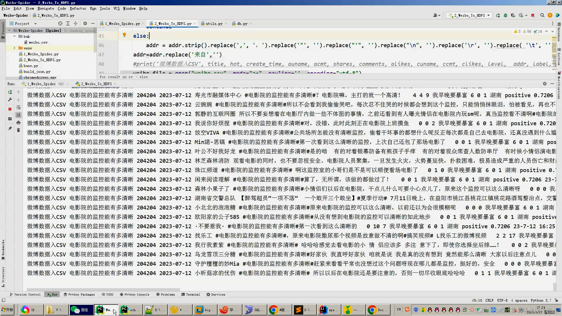 使用urllib获取微博的cookie伪装成人类访问,从而点击微博新闻首页,根据爬取的热搜词条,抓取热搜词条对应的新闻数据,使用requests框架获取数据,当抓取到html以后,用BeautifulSoup进行解析,抓取到需要的数据如:用户名、微博名称、点赞量、转发量、发布时间、地区等关键信息,存储到mysql数据库作为数据集使用;