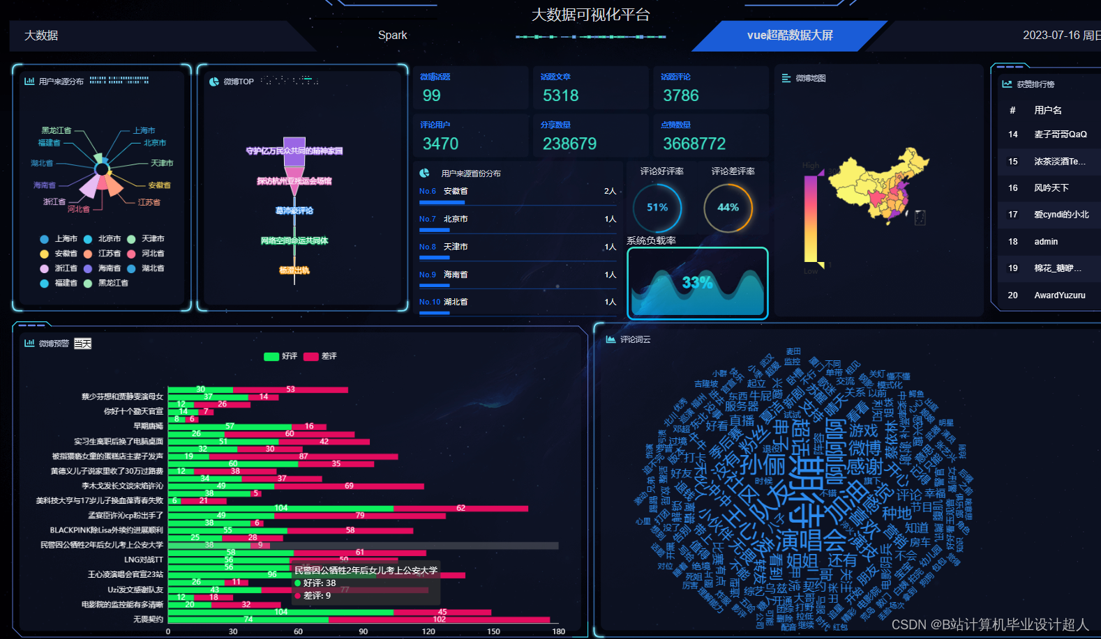 数据统计分实时统计和静态统计,热词使用websocket技术与SpringBoot后台实时通信获取热词动态显示,静态数据通过vue发送http请求与后端SpringBoot交互获取json数据。所有分析的数据使用echarts进行大屏显示。实时计算的时候使用Spark大数据框架的SparkSQL模块进行数据分析。