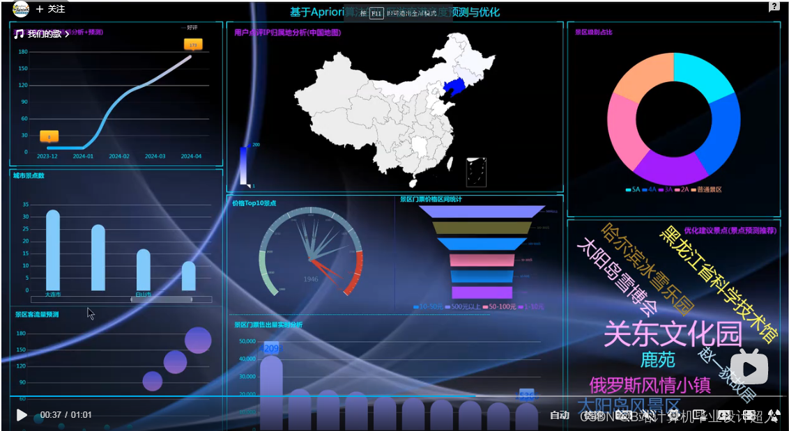 三、 研究方式和方法 (一)使用vmvare导入centos7镜像搭建Linux开发环境; (二)在虚拟机中安装并配置jdk1.8、hadoop、azkaban、hive、mysql等大数据生态圈组件; (三)使用Python的DrissionPage自动化工具框架爬取驴妈妈旅游网站本地景点数据,爬取完成以后存入.csv文件中; (四)编写shell脚本对虚拟机中的.csv原始数据进行数据清洗:去除重复数据、错误数据、补齐缺失字段、数据校校验等,最终的.csv旅游数据文件文件上传至hdfs文件服务器; (五)通过hive工具将hdfs中海量旅游数据.csv文件导入数据仓库; (六)编写hive脚本对数据仓库分DWA、DWB、DWT三层数仓架构; (七)离线指标编写shell脚本调用hive_sql语句对DWA层的数据进行多种维度计算,经过DWB、DWT层形成最终统计数据;实时指标编写Spark之Scala脚本对hdfs中的.csv文件进行分析; (八)编写shell脚本调用sqoop框架把DWT层的数据传输到mysql中方便制作BI报表; (九)封装以上全部shell脚本,使用azkaban调度工具进行一键调用; (十)使用Flask+echarts搭建可视化web环境。使用柱状图、饼状图、折线图、中国地图等直观展示可视化统计结果,指标有:各省星级景点数量、各等级景区收入占比、各省景点销售额、全国热门景点Top、各省景点平均票价、各省景点销售额占比、全国景点信息滚动动态图(景点名称、地区、等级、评分、评论数); (十一)启动Flask,完成可视化统计图web端展示; (十二)使用sprringboot+vue.js搭建推荐系统,进行个性化旅游景点推荐、购票等业务功能实现; | |