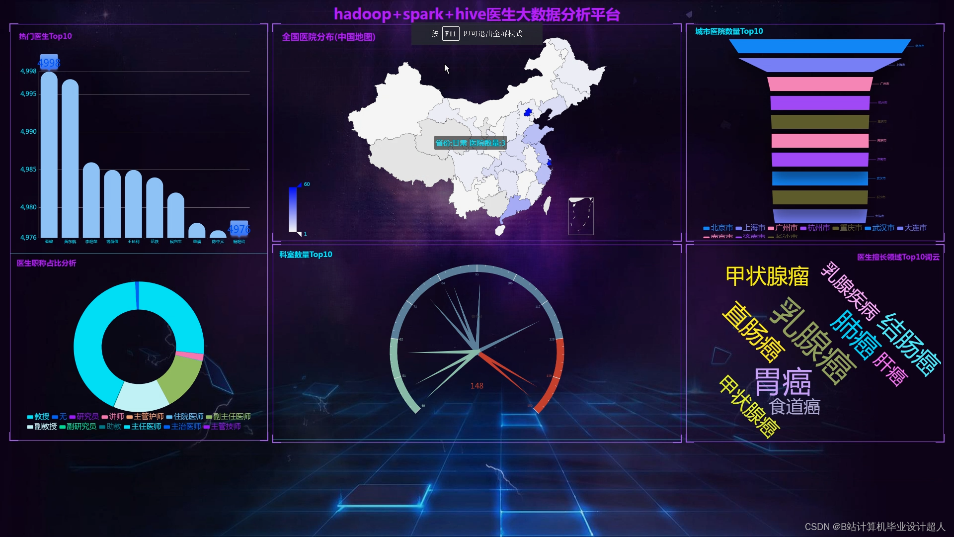 已具备的实验条件 1.硬件条件:阿里云服务器一台、windows笔记本电脑。 2.软件条件:完整的Python、Java、大数据开发环境如jdk1.8、maven、mysql、vmvare、pycharm、idea、anaconda3。 3.知识储备条件:github开源库、黑马大数据相关实战项目教程、优快云技术博客、实习经验。 具体参考文献 [1]周朴雄. 基于时空大数据的医院选址研究[D]. 中国科学技术大学, 2020. [2]胡伟. 大数据时代医院数据可视化系统的设计与实现[J]. 中国数字医学, 2022, 14(11): 4. [3]王宁, 王云光, 陈秀芳. 基于大数据的医院门诊数据分析与挖掘应用[J]. 中国卫生信息管理杂志, 2023, 16(3): 5. [4]张明. 基于大数据的医院感染监测与控制平台的设计与实现[D]. 北京大学, 2023. [5]高昕. 大数据在医院管理中的应用与展望[J]. 中国医院管理, 2023, 37(3): 4. [6]刘婷婷, 王宁, 王云光. 基于大数据的医院信息可视化系统设计[J]. 中国医疗设备, 2023, 31(11): 5. [7]陈洁. 大数据分析在医疗卫生行业中的应用与发展[J]. 中国卫生信息管理杂志, 2022, 12(6): 7. [8]王莉, 王云光, 陈秀芳. 基于大数据的医院门诊流量预测模型研究[J]. 中国数字医学, 2023, 9(12): 3. [9]李春雷, 王云光, 陈秀芳. 基于大数据的医院患者满意度分析与应用[J]. 中国卫生信息管理杂志, 2023, 10(6): 8. | ||||