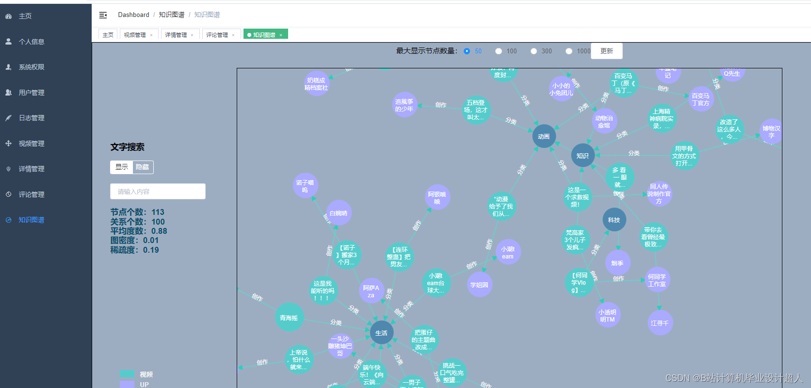 - 后台管理模块:用户管理、权限管理、视频管理、知识图谱、评论管理、订单管理;