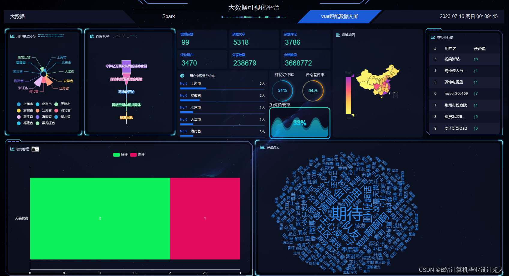 - 对系统进行设计与实现,实现的系统更主要包括了:信息采集模块、信息预处理模块、智能分析处理模块、微博热点话题分析模块。借助于spark平台在海量数据存储和数据挖掘方面的能力,设计一套微博热点话题分析管理系统。在数据采集模块,通过网络爬虫对于国民的微博数据进行采集。这些数据通过处理、去重之后,得到便于后续处理的数据。在数据预处理模块,利用TF-IDF算法进行特征向量空间的建立。对于采集的原始数据进行分析与处理,对于访问公网的数据消除网页噪音数据,依据分词技术,对于访问的内容进行分解,产生摘要信息,然后进行归类。智能分析模块,对于内容倾向性的分析,其核心就是文本的聚类,聚类的结果也直接决定了微博热点话题分析管理系统分析的结果。微博热点话题分析模块,是依据分类的大小,对于文章的点击量以及评论数等信息计算文章的热度,进行将热点的话题选择出来,依据时间段中的热点度增量的变化,进行突发事件舆情趋势的分析。