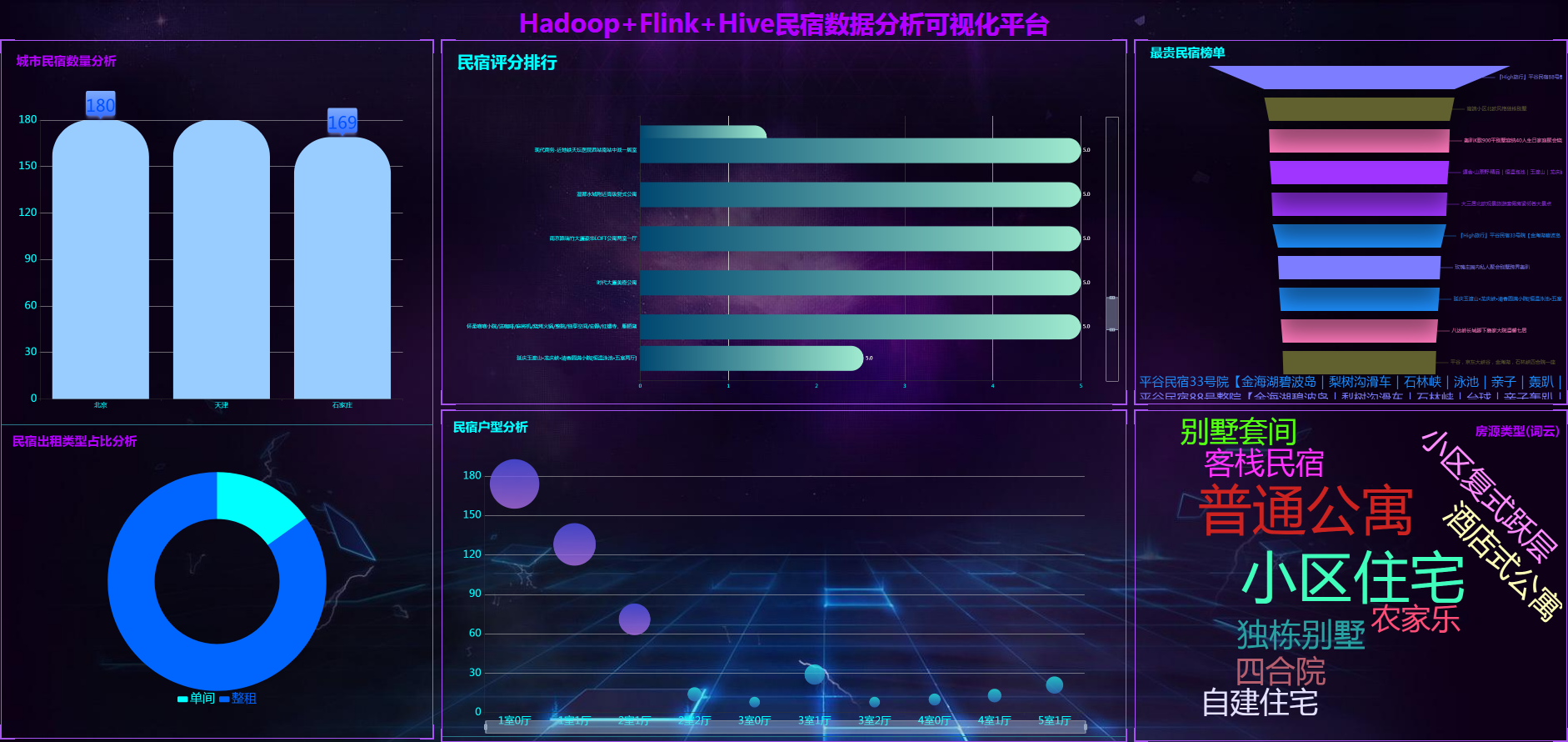 随着旅游业的快速发展和人们对于旅行体验的不断追求,民宿作为一种新的住宿选择方式,得到了越来越多人的喜爱。然而,随之而来的问题是如何更好地管理和分析民宿数据,提供相关的决策支持和可视化分析,以促进民宿行业的可持续发展,大数据技术的应用为民宿行业提供了更多的机会和挑战[4]。本研究旨在基于大数据技术设计并实现一个民宿数据可视化分析系统,以提供全面的数据分析和决策支持,让民宿的各个维度的数据指标更加全面生动的展示出来,帮助民宿经营者和旅游相关决策者更好地理解和分析民宿市场,提高民宿的运营效率和用户满意度。帮助消费者提前了解民宿的市场环境,对民宿的选择提供参考作用[5]。