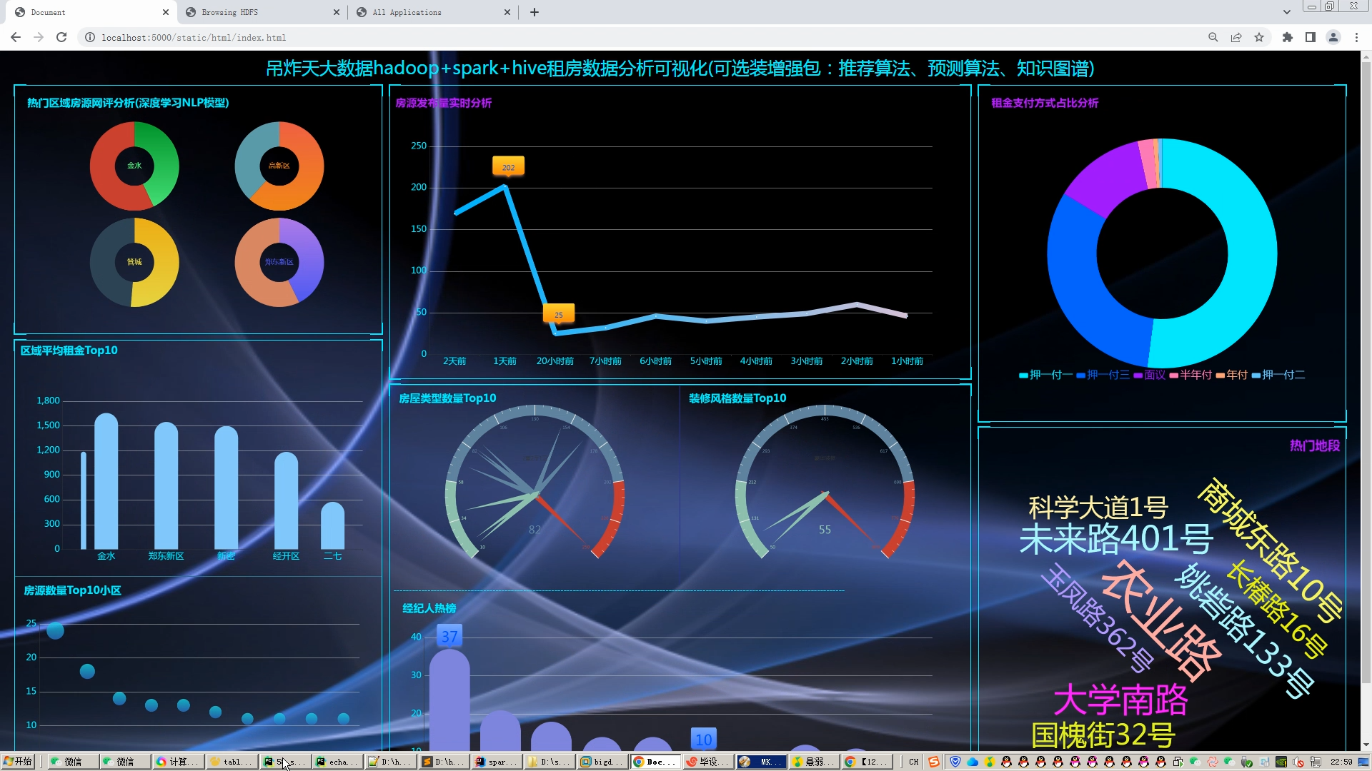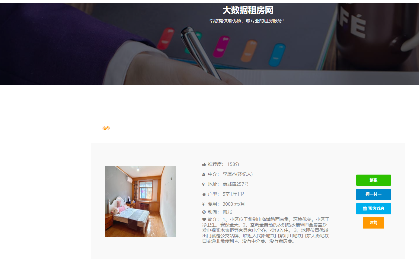 The system is mainly composed of big data system, visual front-end system, Web background management system, rental recommendation system, rental small program /APP end. The large-screen statistical end is completed by Hadoop + Spark, data collection is developed by Java offline analysis end, web client end and background management using Springboot+ Mybatis framework. In the visualization stage, Echarts is used to provide interactive intuitive data visualization charts. The database used in this system is MySQL database, which is used to store a large number of rental information data sets obtained by crawler and the analysis results after data processing. Data analysis is completed through Spark parallel computing for data extraction, multidimensional analysis, query statistics and other operations. The development of a system integrating the analysis, recommendation, visualization and management of rental data based on big data.