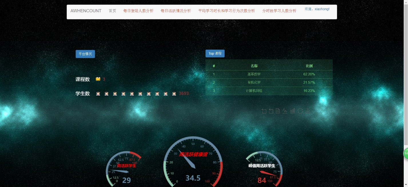 本次课题主要通过使用ECharts图形可视化开发技术,从而在项目中反馈自己的学习成果,提升自己技术水平和能力,让自己在设计方面也能得到更多锻炼,思维模式得到扩展。通过在线教育平台的数据,利用所学知识去分析数据,得出学生在学习过程中学习情况,以及利用课程平台中的健康度和用户活跃度来反哺提升课程质量。