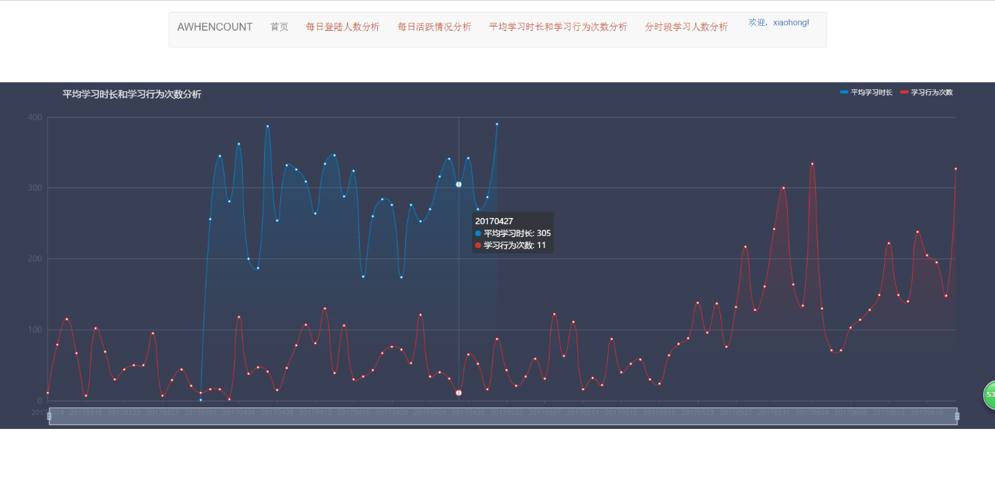 读取HBase中相关数据,页面显示不同日期对应的学习时长和学习次数。