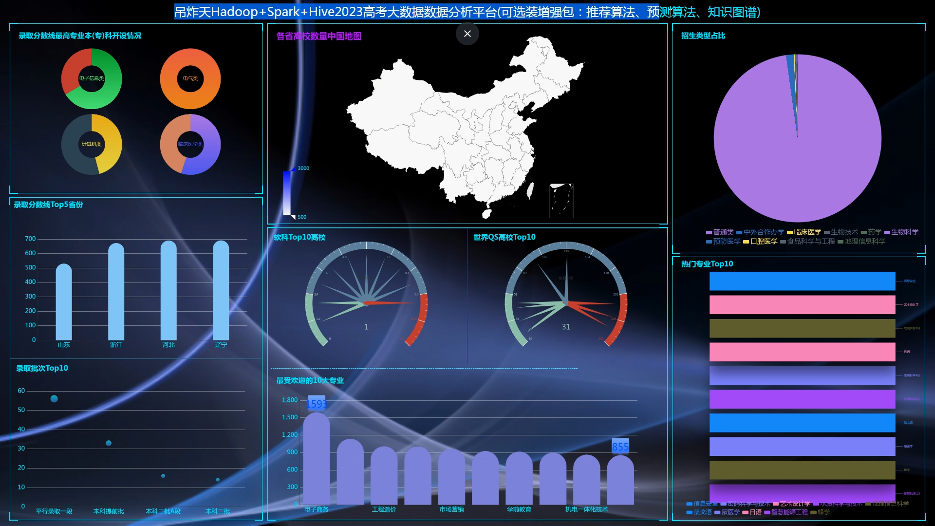 摘要:随着我国高考制度的不断完善以及大数据技术的迅速发展,高考志愿推荐系统的需求日益增长。本文着重探讨了如何利用Apache Spark这一强大的大数据处理框架,构建一个高效、准确的高考志愿推荐系统。该系统以springboot程序为基础,通过对海量数据的挖掘和分析并将数据存储到mysql数据库,结合考生的兴趣、成绩和职业规划等因素,为其提供个性化的志愿推荐。首先,本文介绍了Spark的核心概念和数据处理流程,以及其在高考志愿推荐系统中的应用价值。然后,详细阐述了系统的架构设计,包括通过Python爬虫进行数据采集、预处理、模型训练和推荐生成等关键环节。此外,文章还深入讨论了实现个性化推荐的算法和技术,如协同过滤、矩阵分解和深度学习等。然而,在实践中,我们也面临着一系列的挑战。例如,数据稀疏性、冷启动问题以及算法的可扩展性和准确性等。针对这些问题,我们提出了一系列优化策略和解决方案,如采用混合推荐算法、引入用户画像和动态调整模型参数等。最后,本文通过实验验证了基于Spark的高考志愿推荐系统的可行性和有效性。实验结果表明,该系统在提高推荐准确率、用户满意度和降低填报成本等方面具有显著优势。同时,该系统的实施也有助于推动教育信息化和个性化教育的发展,为考生提供更加科学、全面的高考志愿填报服务。