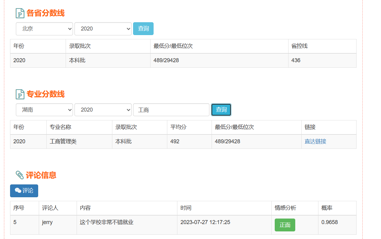 随着科教兴国战略和人才强国战略的逐步实施,我国高等教育取得了超常规的跨越式发展,其中具有历史意义的变化就是高等教育规模的迅速扩大。全国高考报名人数在2020年已经突破了1000万大关,也就是说,每年将会有超过1000万的高考考生进行高考。谈到高考,就不得不说高考志愿填报这件事情,无论是上本科还是上专科,志愿填报是必须走的一个重要流程。高考志愿填报和高考都是人生中最重要的一步。如果说高考是为了获取高等学府的敲门砖,那么志愿填报将会影响到考生未来的前途。填报志愿科学、合理,就能够提高被和考生考试成绩相符合的高校录取的概率;如果志愿选择不当,找不准与考生考分相对应的高校,即使考出了不错的成绩,也可能与重点大学擦肩而过,或者高分低就,甚至会出现落榜的情况,被迫走征集志愿,留下终的遗憾。所以有人说,高考成功与否,70%靠实力,30%看志愿。所以我们针对这个现状,利用大数据的手段,对高考志愿填报进行研究,预测各高校录取线所在区间,为高考志愿填报提供建议。与传统在书本上获取高校招生信息相比,在线推荐系统[1]有着很多优点:(1)检索便捷,考生可以通过多种检索途径进行检索,比如录取批次,文理类别,院校地区等途径进行快速且精准的检索。(2)信息量大,在线系统能够提供海量的高校信息,相比高考志愿录用信息相关的书本而言,在线系统的信息能够更全面。 (3)使用方便,在线系统后端使用数据库对数据进行存储,相比于厚厚的一本高考志愿利用信息相关的书籍,使用在线系统搜寻信息更加便捷。