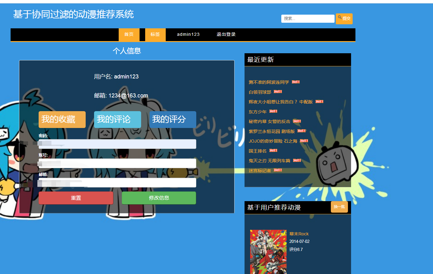 本系统web端的功能模块,主要实现动漫显示、动漫分类显示、热门动漫排序显示、收藏动漫排序显示、时间排序显示、评分排序显示、算法推荐、动漫搜索、动漫信息管理等功能,并进行数据库的详细设计,完成设计阶段的各项功能,并对此系统进行功能测试,最后,系统进行相关的实际应用操作,通过系统的使用,用户进入动漫推荐系统,此系统可以根据用户对动漫所打的标签行为,给用户推荐用户所感兴趣的动漫,准确率在百分之75左右,用户可以查看信息,观看动漫,给动漫评分等操作,本系统基本上完成了预期的基本功能。