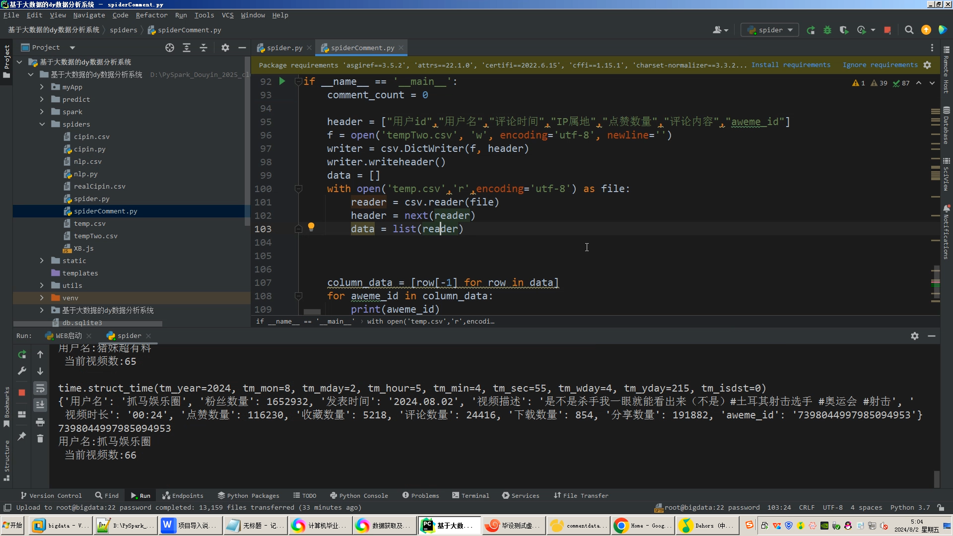 - snownlp 是一个用于处理中文文本的 Python 库,它提供了各种功能来帮助用户执行包括情感分析、词性标注、文本翻译、文本相似度计算、文本摘要、文本分词等多个自然语言处理任务。我们通过他对我们分词的情感进行评估。