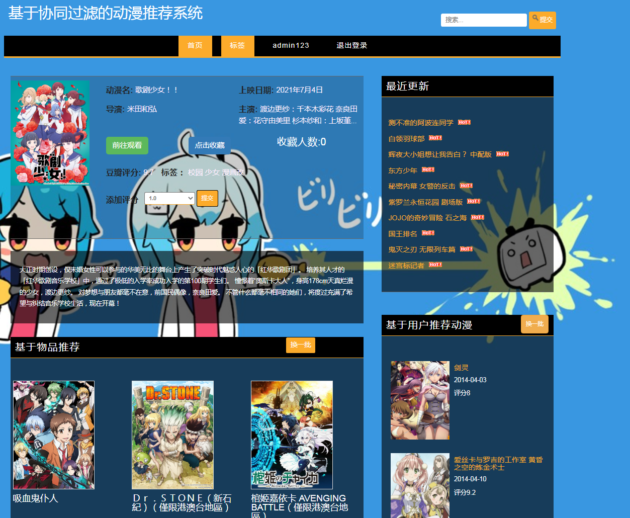 通过以上步骤,该推荐系统实现了基于用户和基于物品的推荐功能,根据用户的标签行为和评分情况,给用户推荐其感兴趣的动漫。系统具有良好的用户界面和高准确率的推荐效果,用户可以方便地查看动漫信息、观看动漫、给动漫评分等操作。整个系统的开发过程经过详细的设计和功能测试,并成功应用于实际场景中。
