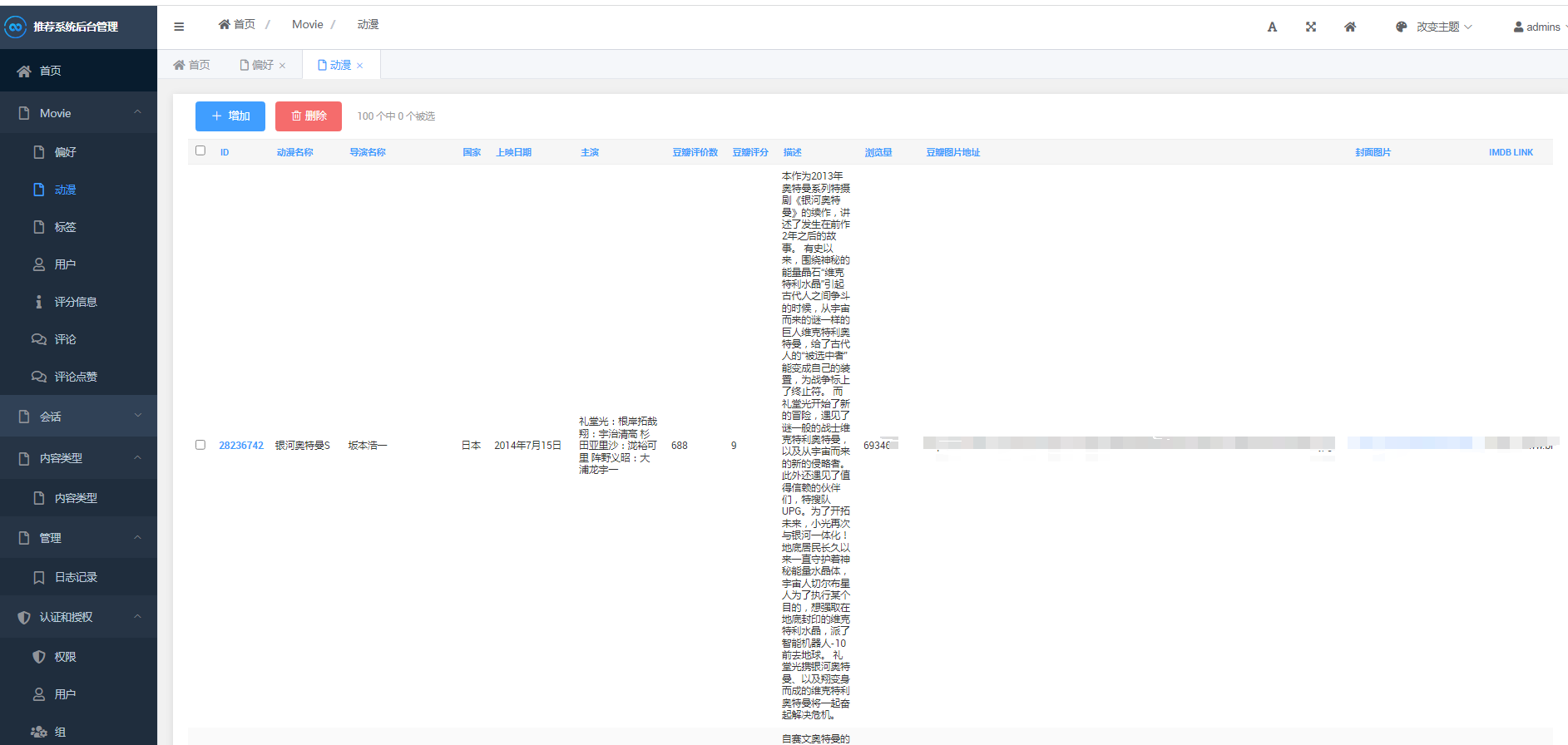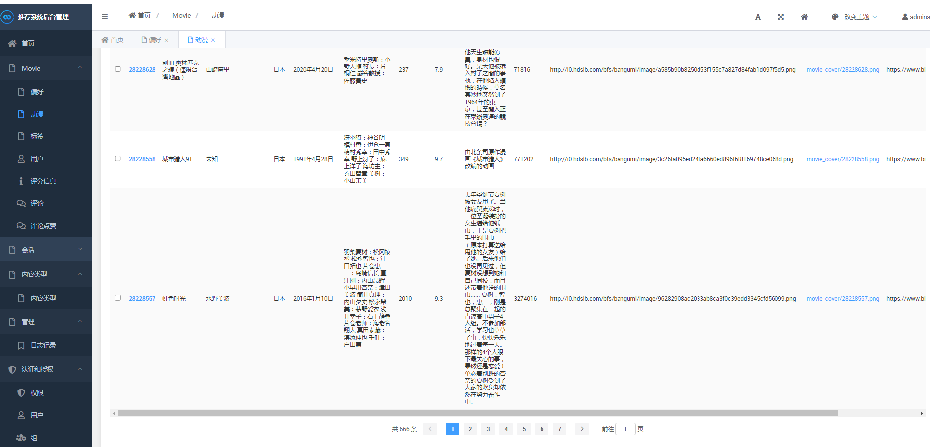 本系统web端的功能模块,主要实现动漫显示、动漫分类显示、热门动漫排序显示、收藏动漫排序显示、时间排序显示、评分排序显示、算法推荐、动漫搜索、动漫信息管理等功能,并进行数据库的详细设计,完成设计阶段的各项功能,并对此系统进行功能测试,最后,系统进行相关的实际应用操作,通过系统的使用,用户进入动漫推荐系统,此系统可以根据用户对动漫所打的标签行为,给用户推荐用户所感兴趣的动漫,准确率在百分之75左右,用户可以查看信息,观看动漫,给动漫评分等操作,本系统基本上完成了预期的基本功能。