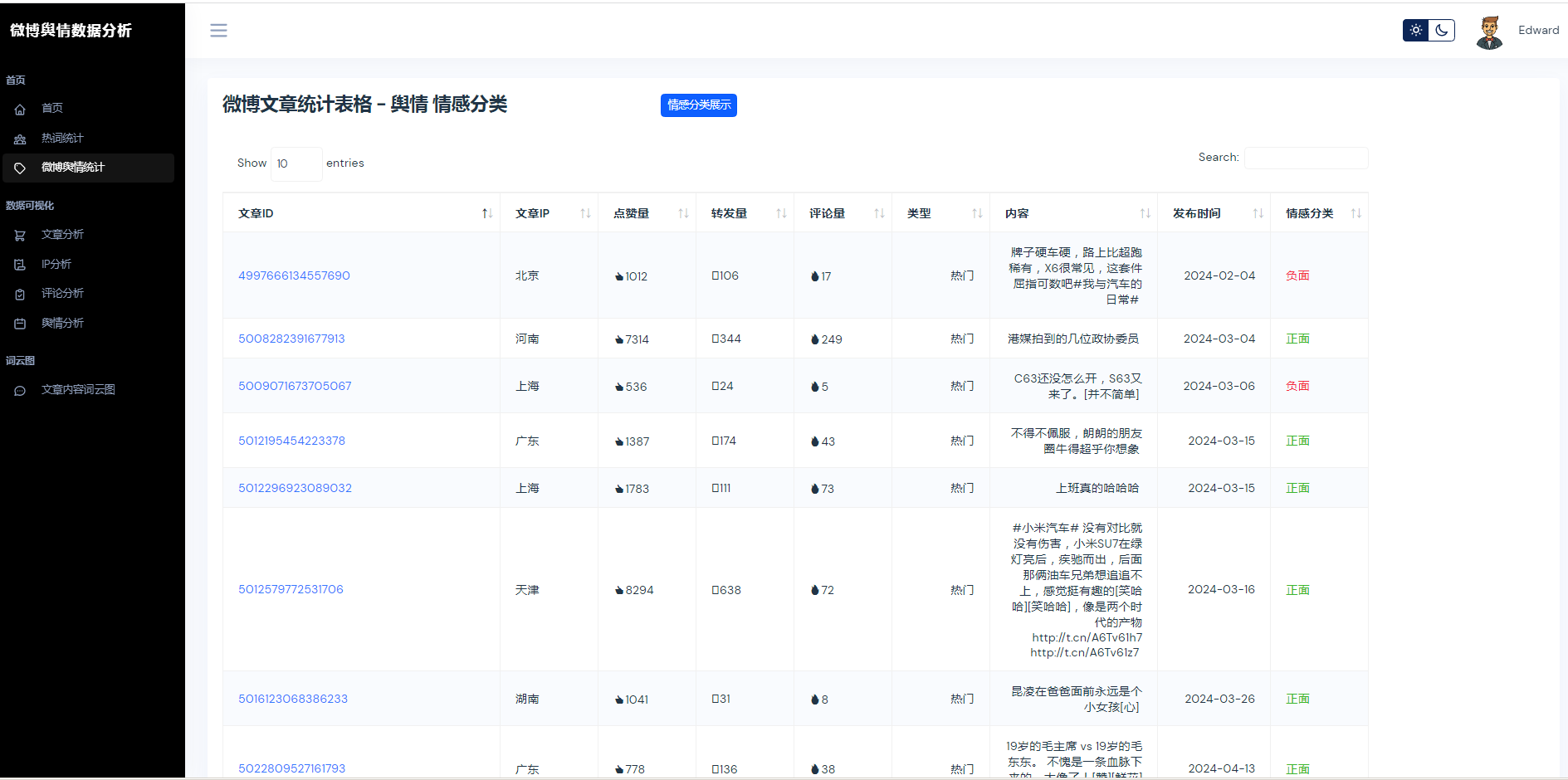 - **情感分析:** 通过自然语言处理技术和情感分析模型,对微博数据进行情感分类和情绪分析。