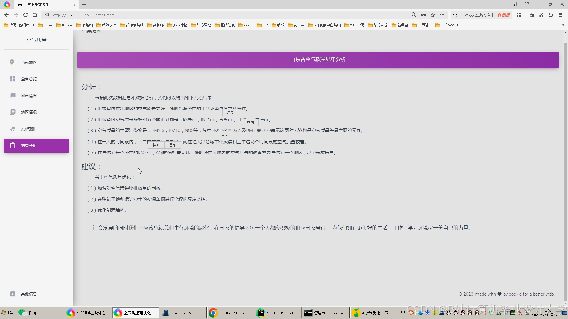 - 研究内容:数据采集与处理、空气质量预测、可视化展示、用户管理、天气预报模块、生活指数模块、地图推荐功能等。