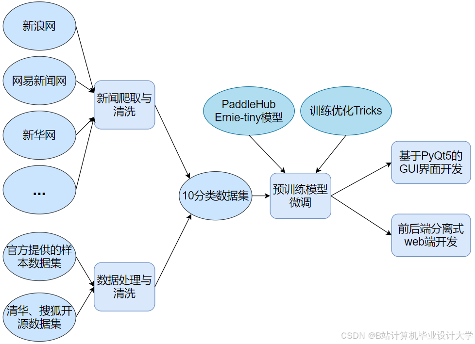 本项目基于PaddleHub通过预训练模型ERNIE-Tiny在整合与爬取的新闻10分类数据集上进行微调完成模型训练,可实现精细的新闻长文本10分类任务:财经、房产、教育、科技、军事、汽车、体育、游戏、娱乐和其他10个类别。最后基于PyQt5完成GUI可视化界面演示并基于VUE+FastAPI完成该项目的web端部署。