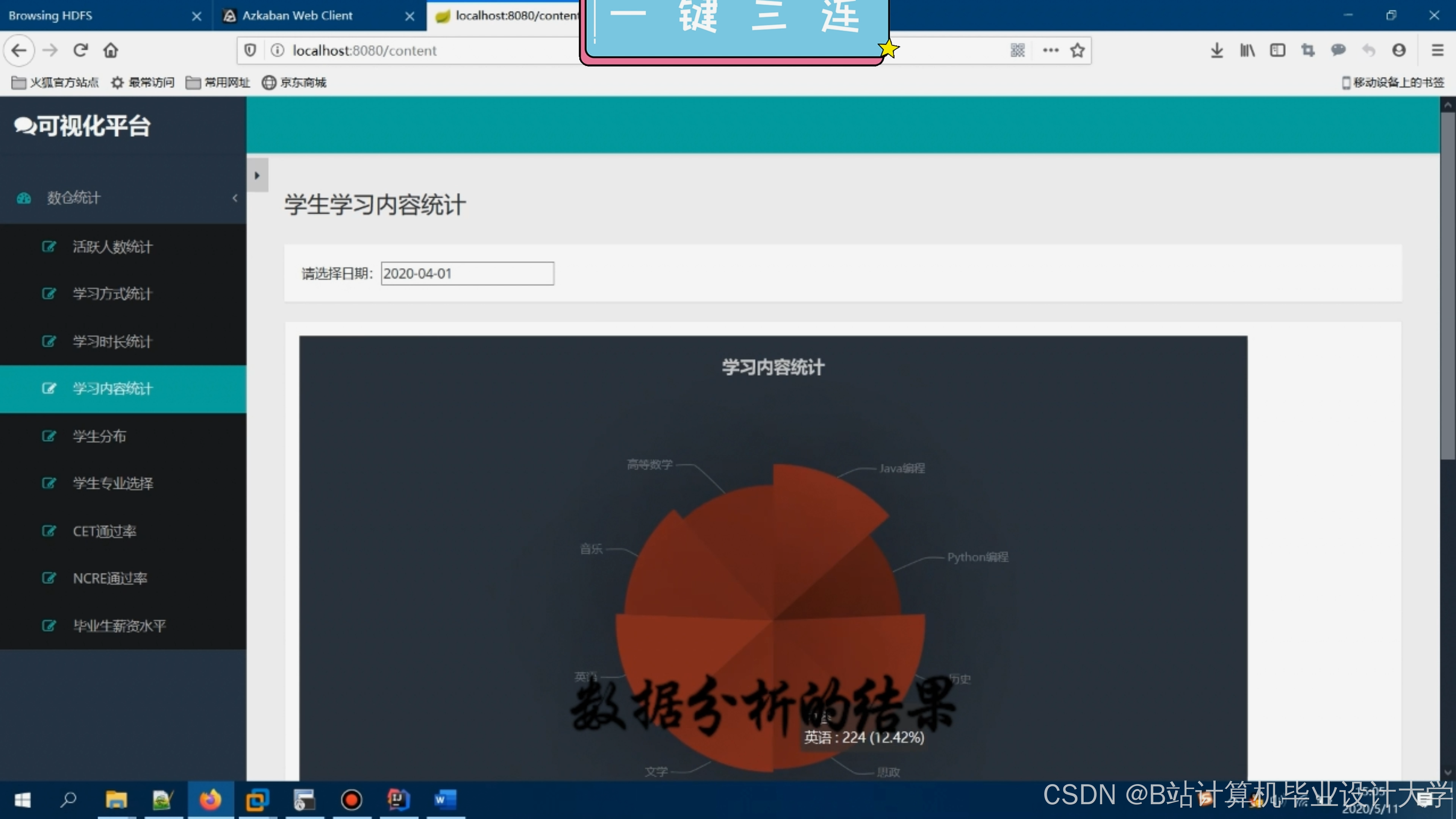 - 可视化展示层:主要利用Flask和Echarts等工具,将分析结果以图表的形式进行展示,方便教育机构和教师直观地了解学生的学习情况。