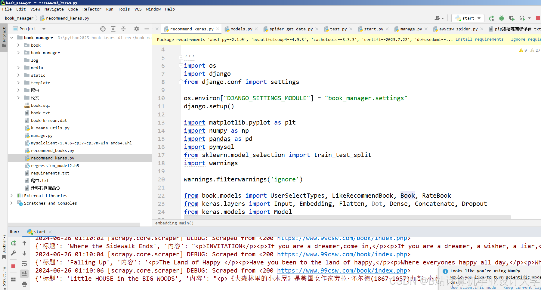 2、创建数据库模型:用户表、图书标签表、用户选择类型表(用户解决推荐算法冷启动问题)、借书清单表、购书清单表、评分表、收藏表、点赞表、评论表、推荐反馈表。然后数据迁移,把表映射到数据库中。