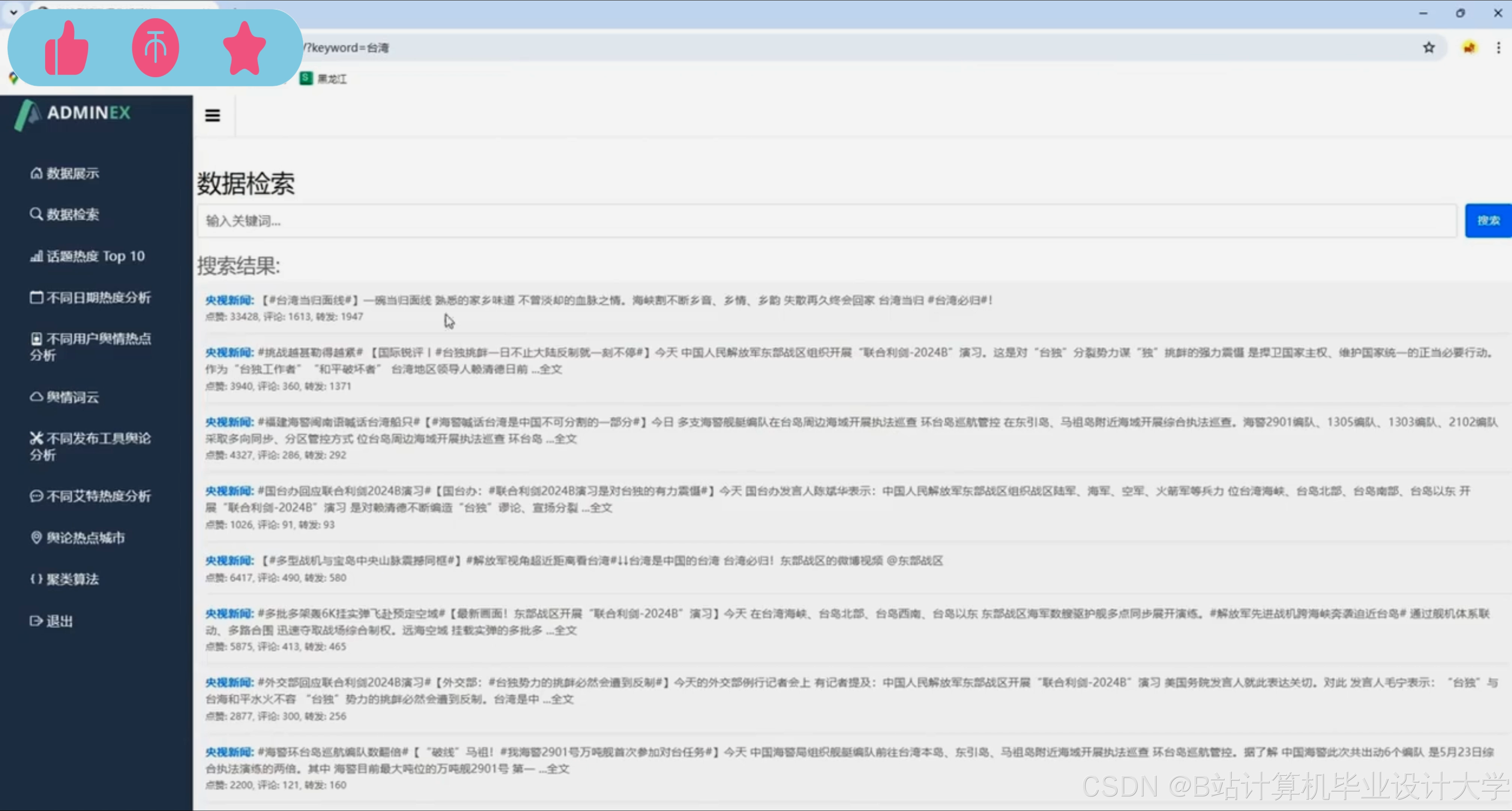 本系统使用Selenium等自动化爬虫工具采集微博数据,包括文本内容、时间戳、用户信息等。采集到的数据首先存储在MySQL数据库中,然后使用Hadoop的MapReduce进行预处理,包括分词、去除停用词、去除标点符号等。