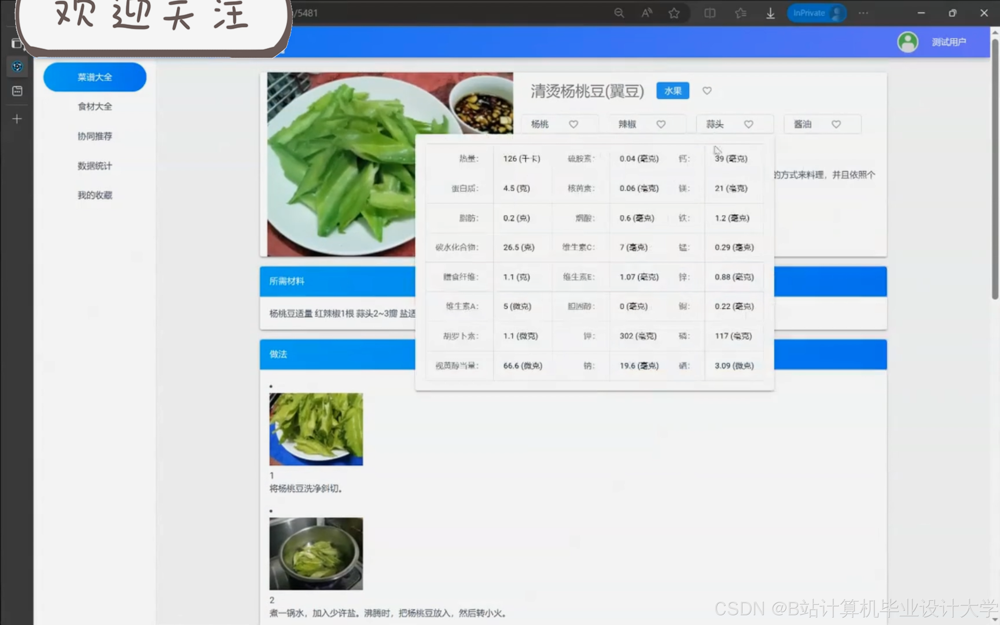 - 设计并实现前端页面,包括用户注册/登录、数据录入、食谱展示等。