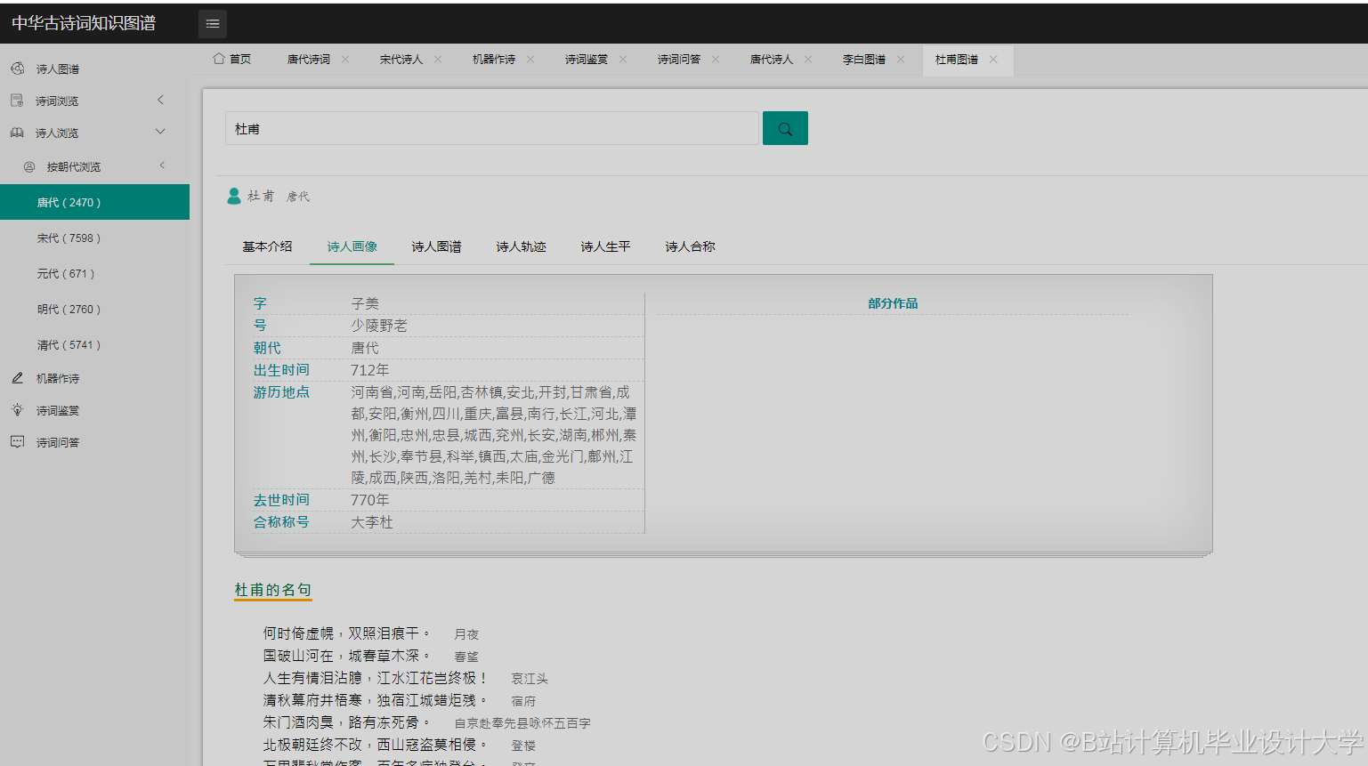 - 可视化系统设计:利用前端可视化库(如D3.js、ECharts)设计并实现古诗词知识图谱的可视化系统。