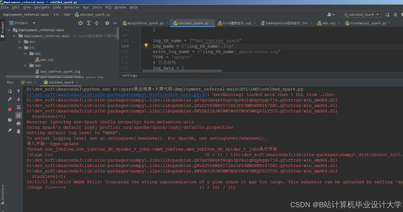 - 数据处理与分析:基于Spark的分布式计算能力,对存储在HDFS中的招聘数据进行快速处理与分析,包括数据挖掘、关联分析、聚类分析以及时间序列预测等。