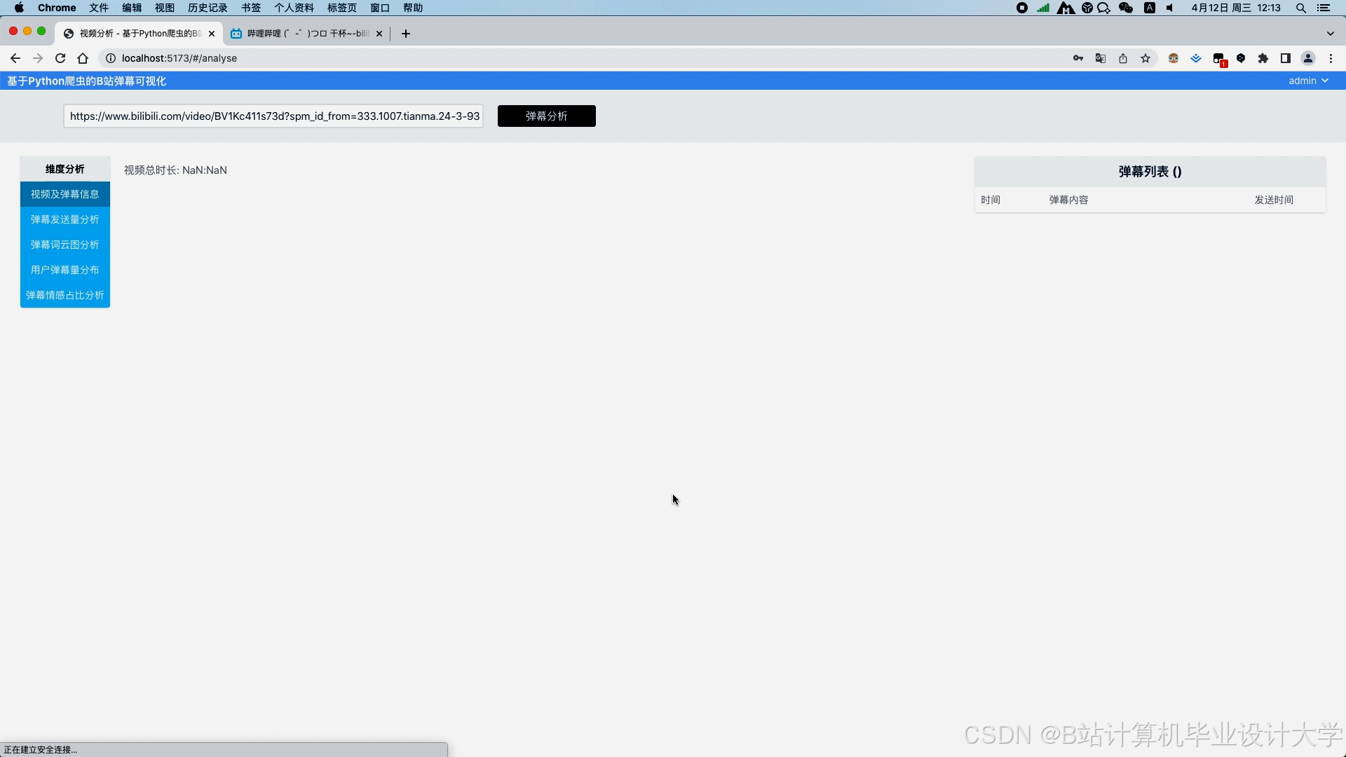 - 2025年6月-7月:利用Django框架设计并实现弹幕情感分析系统的后端服务,包括数据接口、业务逻辑等。同时,进行前端界面的设计和实现。