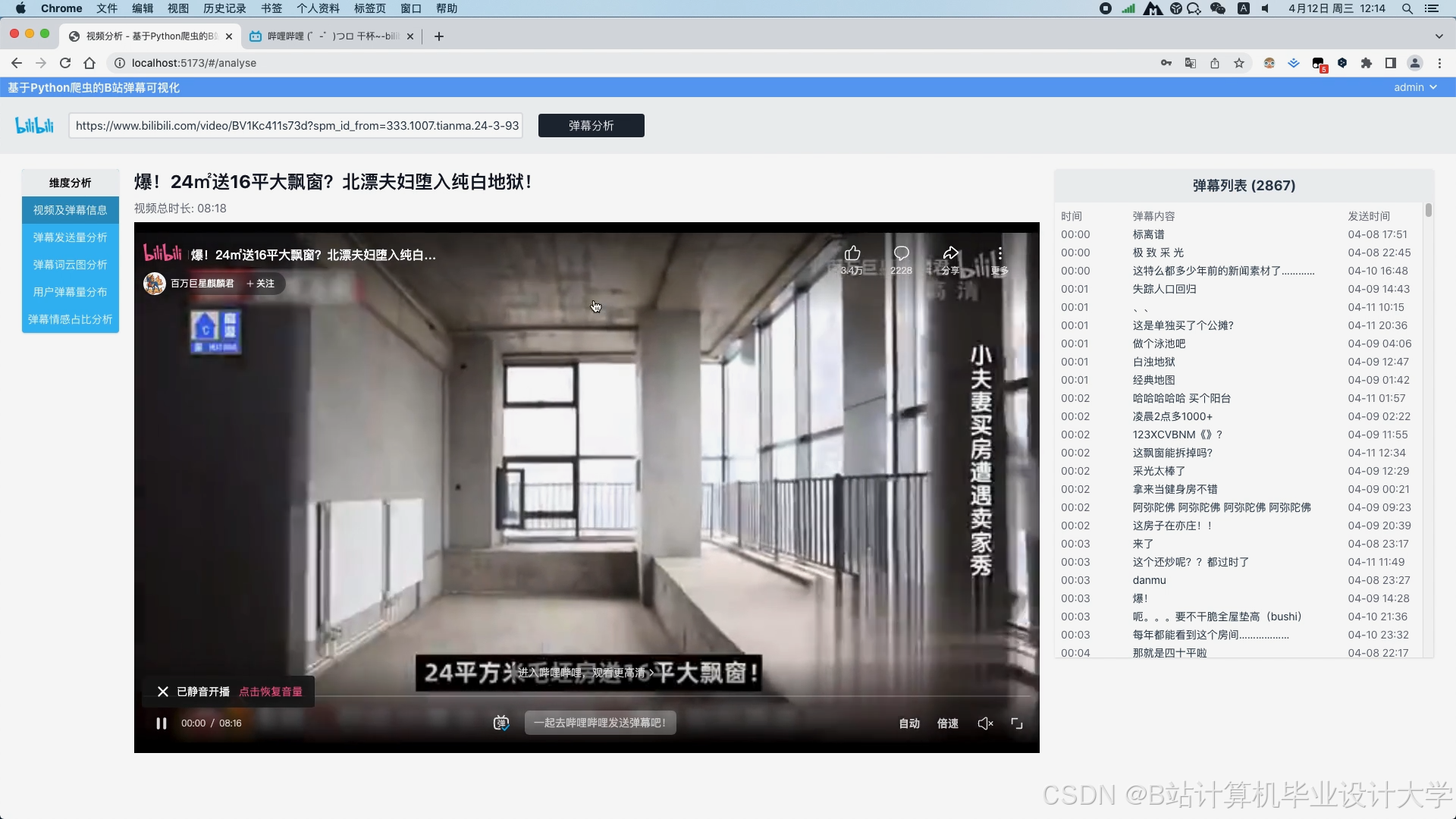 - 数据采集:利用Python爬虫技术,从弹幕视频中实时采集弹幕数据,包括视频标题、封面图、视频地址以及弹幕文本等。