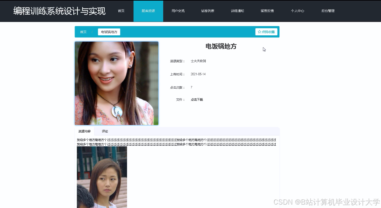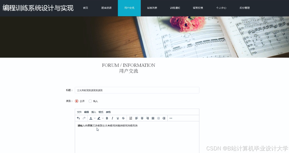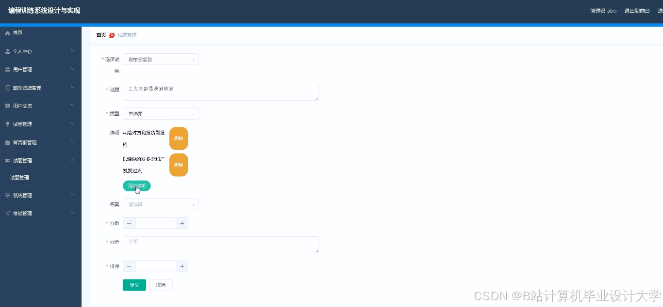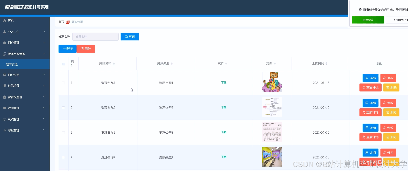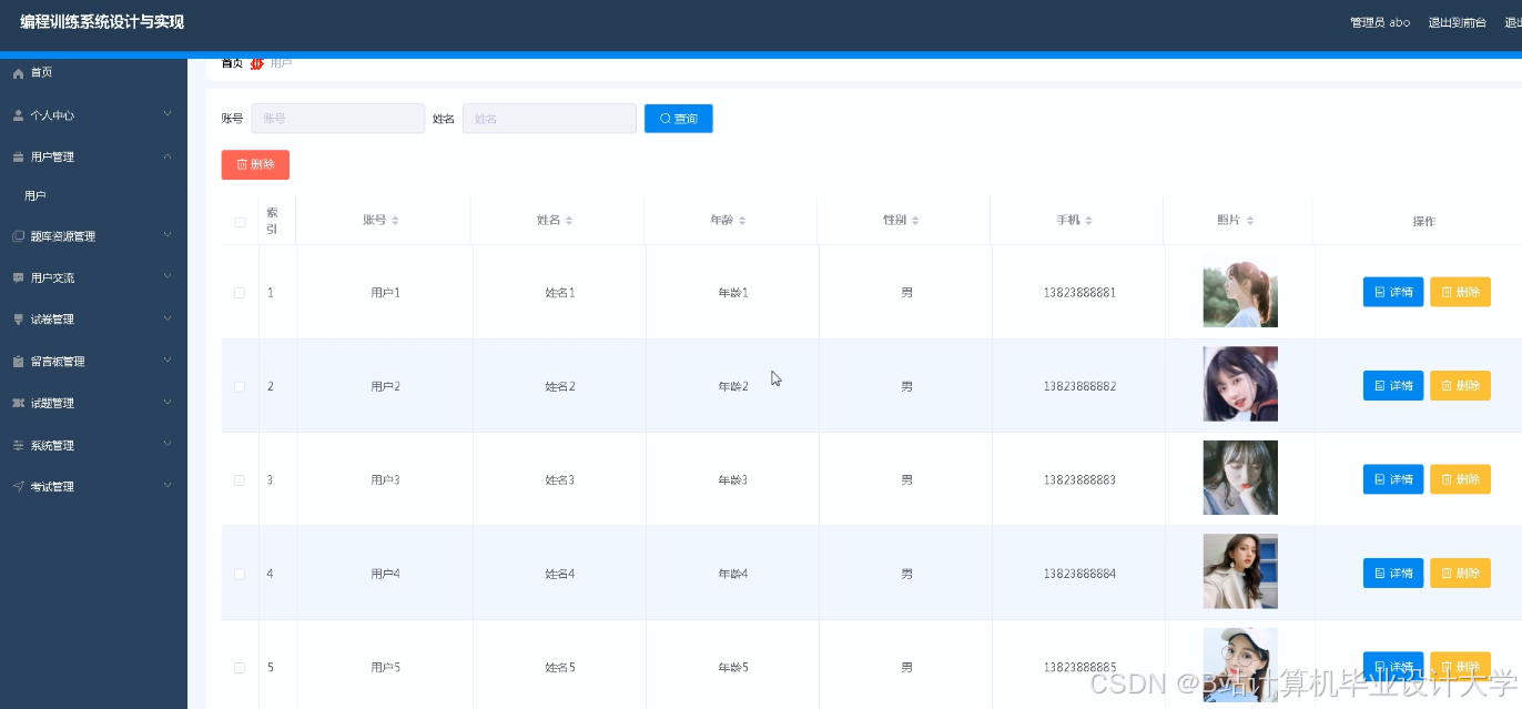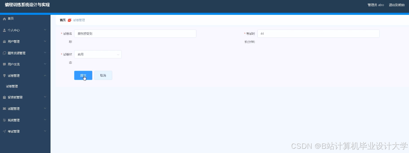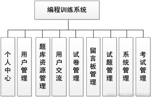 This programming training system administrator function has administrator and user. Administrator functions include personal center, user management, question bank resource management, user communication, test paper management, message board management, test question management, system management, and exam management. Users can view the question bank resources, take the exam, leave a message, and other operations. So it has a certain practicability.