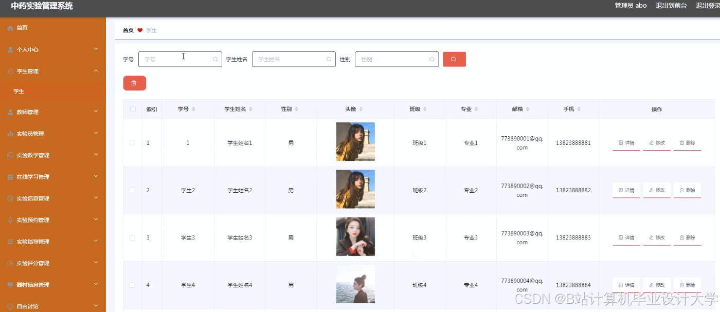 1、社会意义 随着学校办学规模的扩大,现代教育对学生操作动手能力的要求不断增强,我校开设中药实验课教学的课程越来越多,这给中药实验室的管理提出了新的挑战,同时也加重了中药实验室管理人员的负担。为了解决中药实验室管理人员的日常工作繁重问题,提高工作效率,开发一个中药实验管理系统就显得非常有必要。 3、个人收获 通过完成中药实验管理系统的设计与实现课题,可以加强理论水平,提高实践能力。通过一系列的实践,加深对面向对象编程的理解,熟悉软件体系架构设计的基本方法和步骤;学会独立用软件工程的方法分析问题和解决问题。于此同时,在完成过程中,培养查阅文献,阅读相关论文的能力,将遇到的问题逐个解决,培养自己独立分析思考问题的能力和良好的沟通能力。 | ||