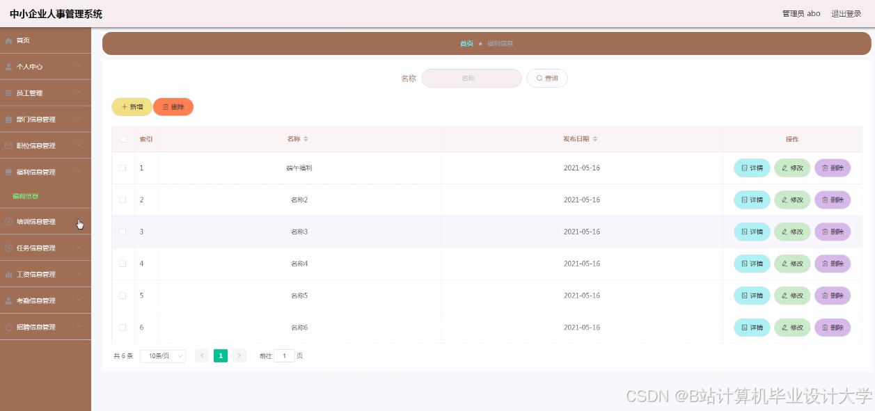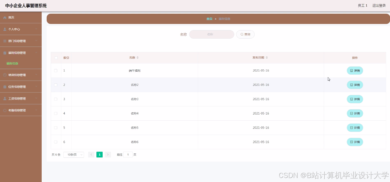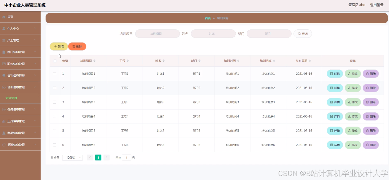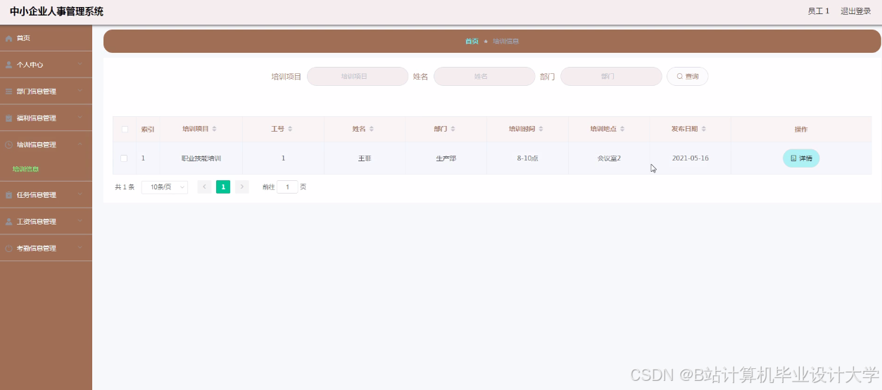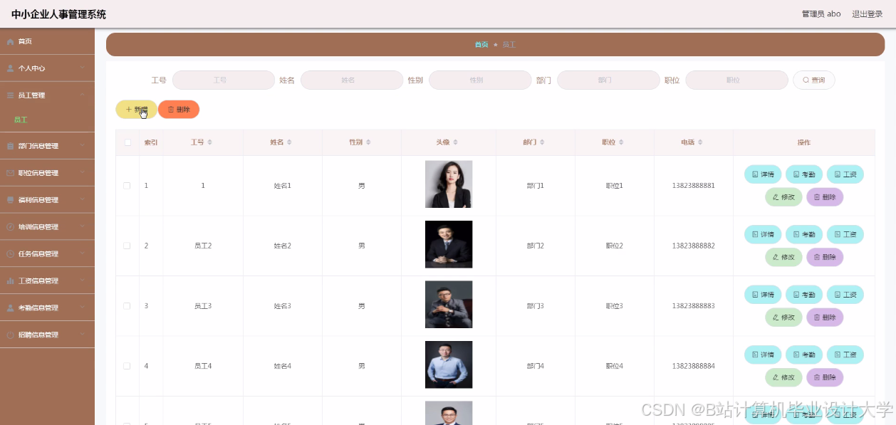 目前许多人仍将传统的纸质工具作为信息管理的主要工具,而网络技术的应用只是起到辅助作用。在对网络工具的认知程度上,较为传统的office软件等仍是人们使用的主要工具,而相对全面且专业的中小企业人事管理系统的信息管理软件仍没有得到大多数人的了解或认可。本选题则旨在通过标签分类管理等方式,实现管理员:首页、个人中心、员工管理、部门信息管理、职位信息管理、福利信息管理、培训信息管理、任务信息管理、工资信息管理、考勤信息管理、招聘信息管理,员工;首页、个人中心、部门信息管理、福利信息管理、培训信息管理、任务信息管理、工资信息管理、考勤信息管理功能。从而达到对中小企业人事管理系统信息的高效管理。