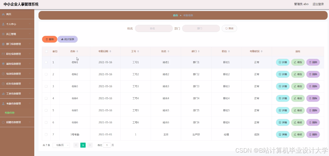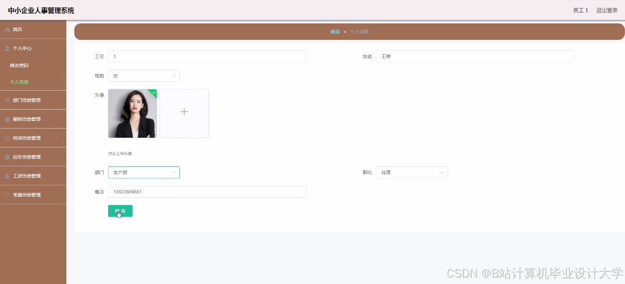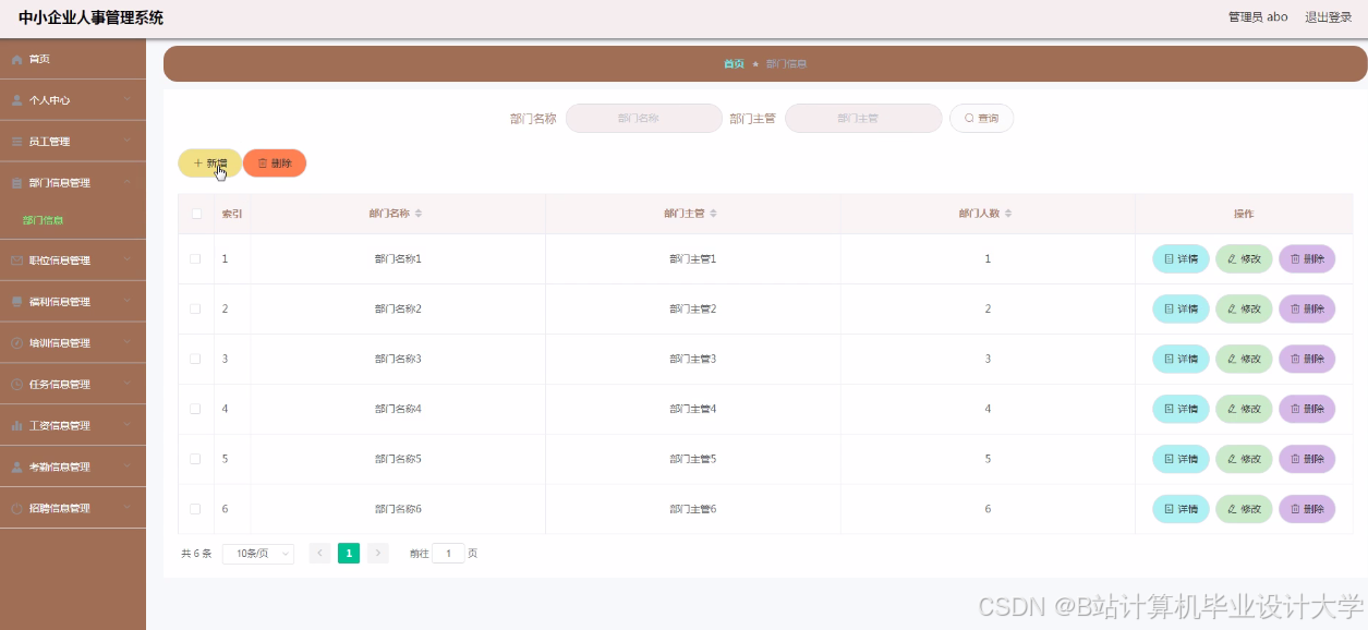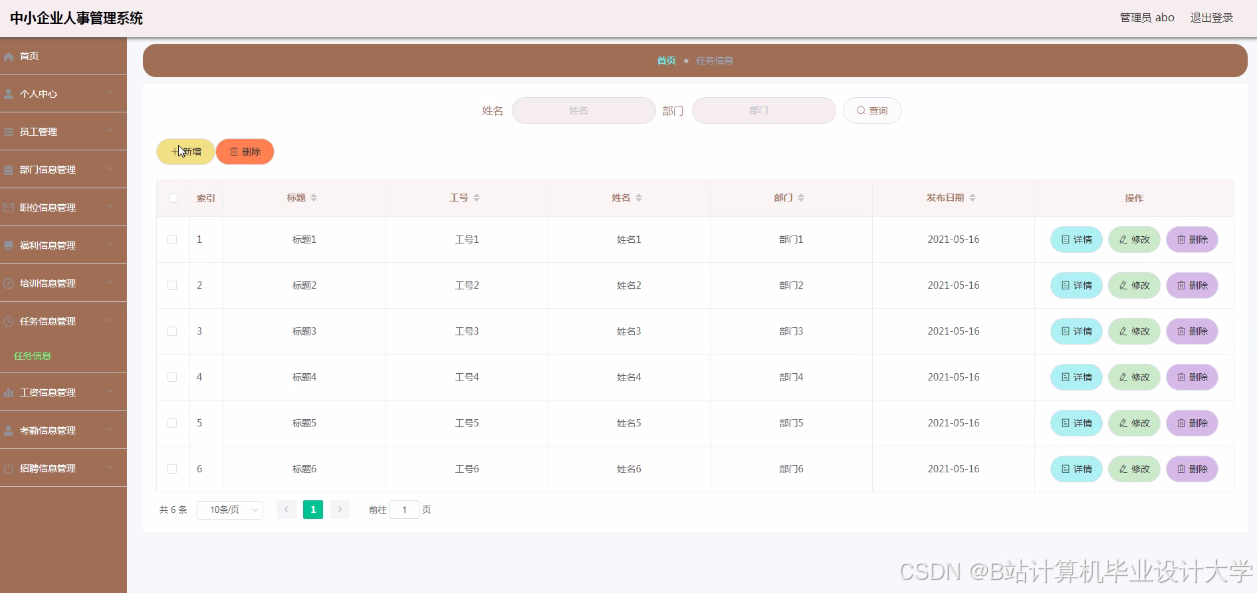 目前许多人仍将传统的纸质工具作为信息管理的主要工具,而网络技术的应用只是起到辅助作用。在对网络工具的认知程度上,较为传统的office软件等仍是人们使用的主要工具,而相对全面且专业的中小企业人事管理系统的信息管理软件仍没有得到大多数人的了解或认可。本选题则旨在通过标签分类管理等方式,实现管理员:首页、个人中心、员工管理、部门信息管理、职位信息管理、福利信息管理、培训信息管理、任务信息管理、工资信息管理、考勤信息管理、招聘信息管理,员工;首页、个人中心、部门信息管理、福利信息管理、培训信息管理、任务信息管理、工资信息管理、考勤信息管理功能。从而达到对中小企业人事管理系统信息的高效管理。