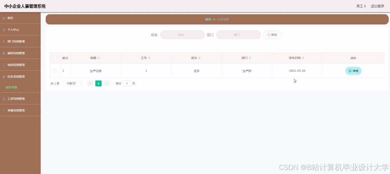 (1)功能要求:可以管理首页、个人中心、员工管理、部门信息管理、职位信息管理、福利信息管理、培训信息管理、任务信息管理、工资信息管理、考勤信息管理、招聘信息管理等功能模块。