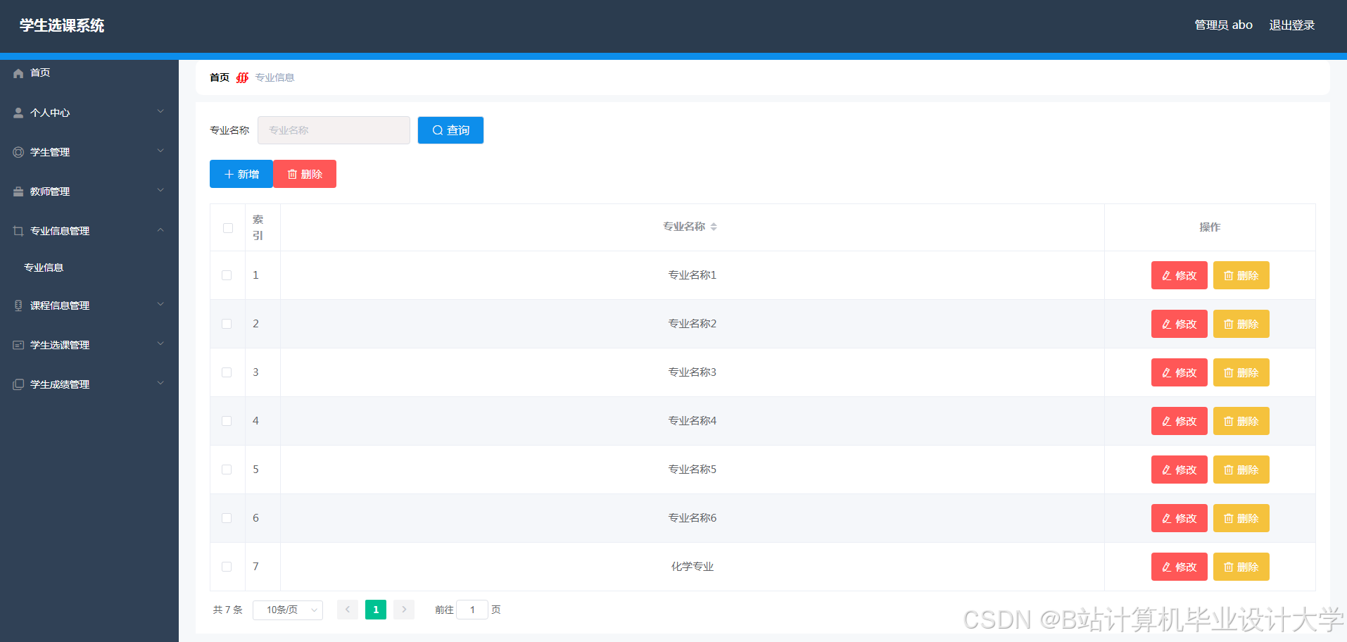 学生选课系统在Eclipse环境中,使用Java语言进行编码,使用Mysql创建数据表保存本系统产生的数据。系统可以提供信息显示和相应服务,其管理员管理专业,教师,学生,课程,查看学生选课以及学生成绩信息。教师查询学生,查询课程,审核学生选课信息,为学生学习的课程进行成绩打分。学生参与课程选课,查询选课信息,查询已选课程的成绩信息。