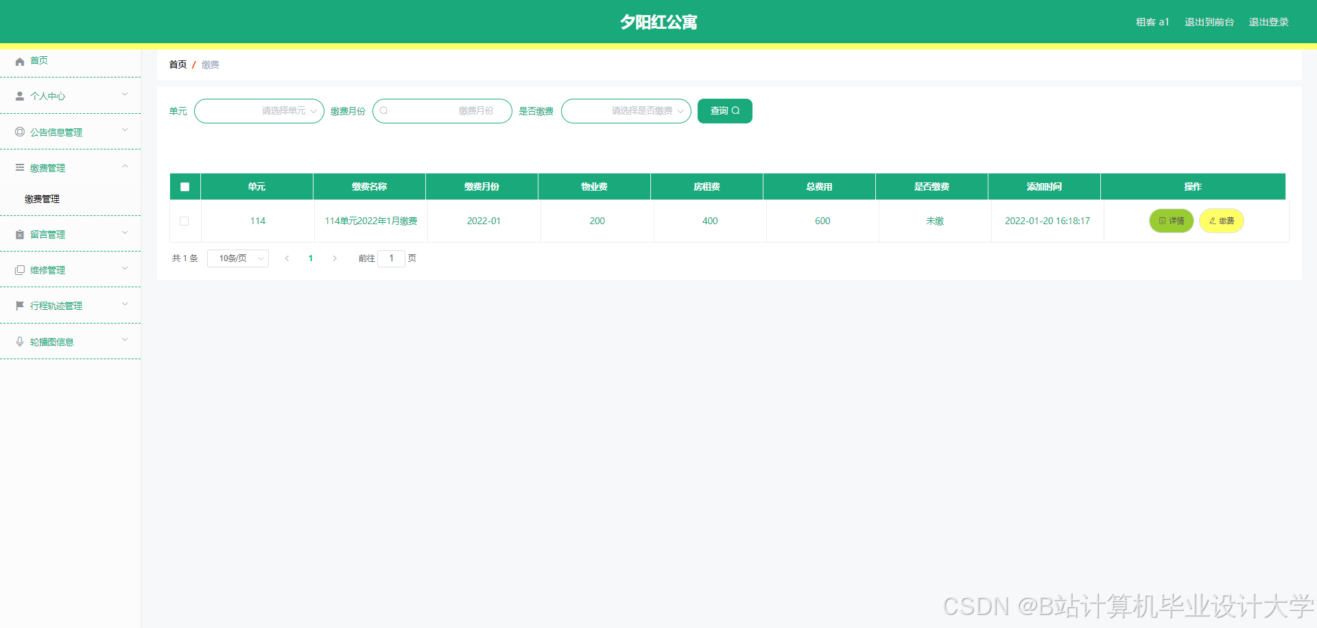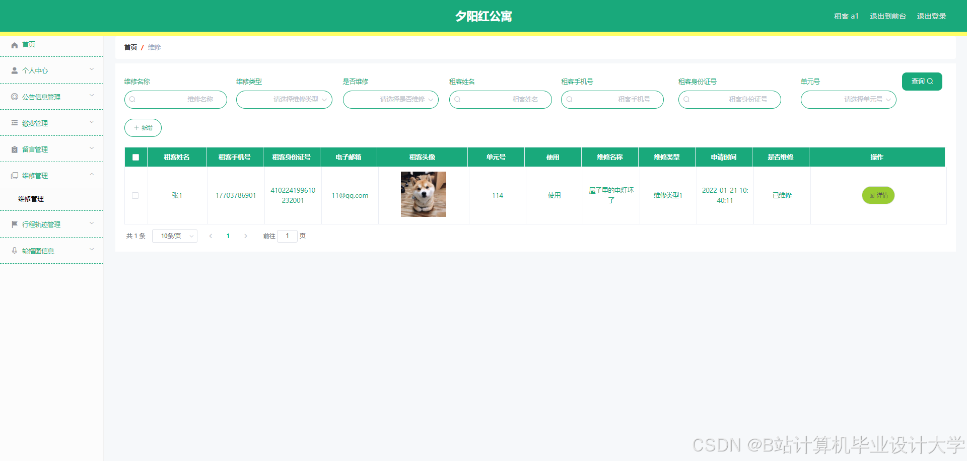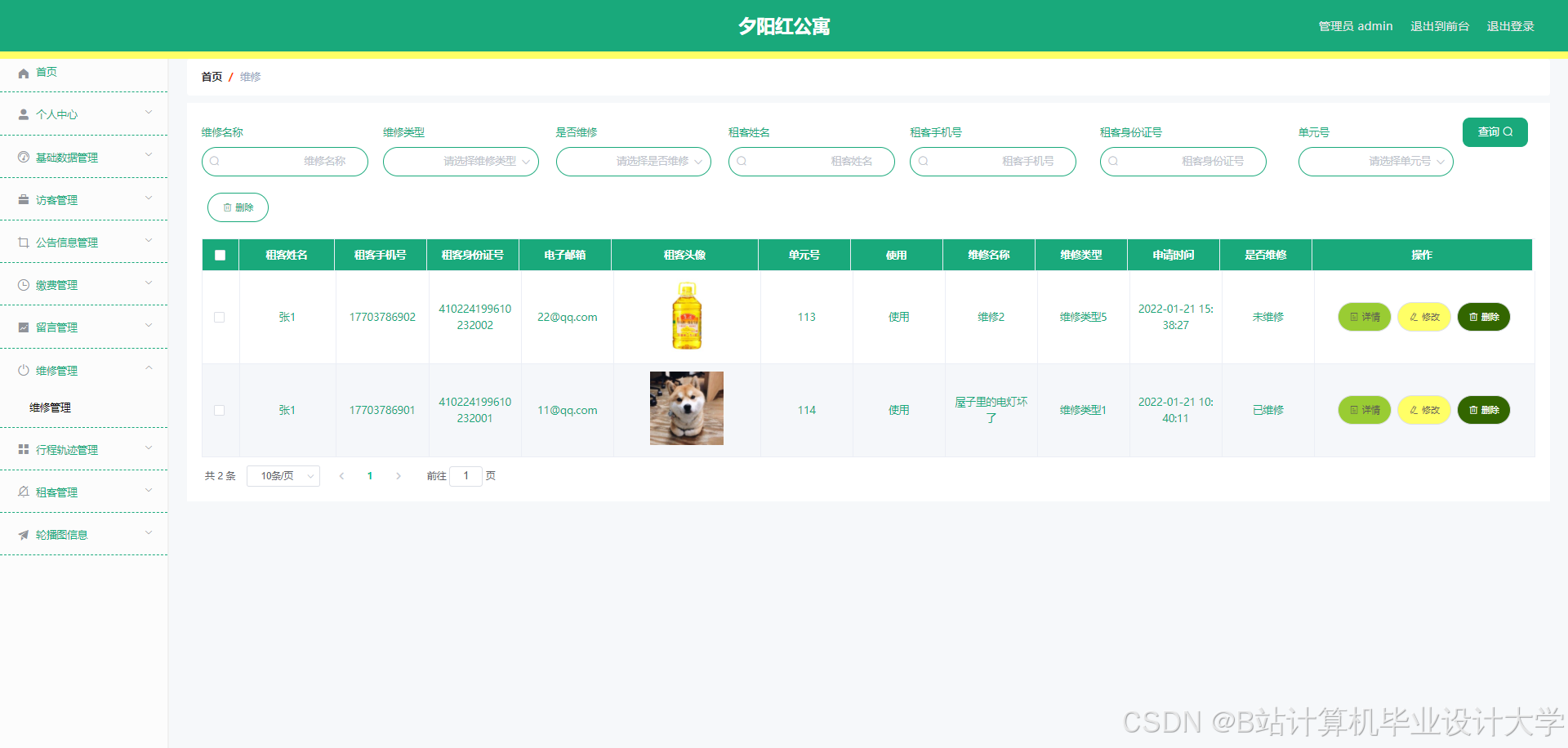 夕阳红公寓管理系统能够实现访客管理,租客管理,维修管理,缴费管理,行程轨迹管理,留言管理等功能。该系统采用了Mysql数据库,Java语言,Spring Boot框架等技术进行编程实现。