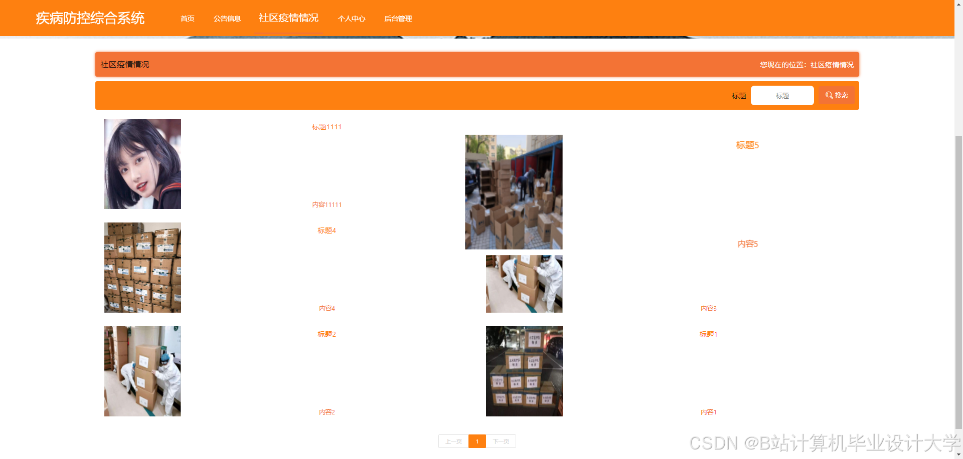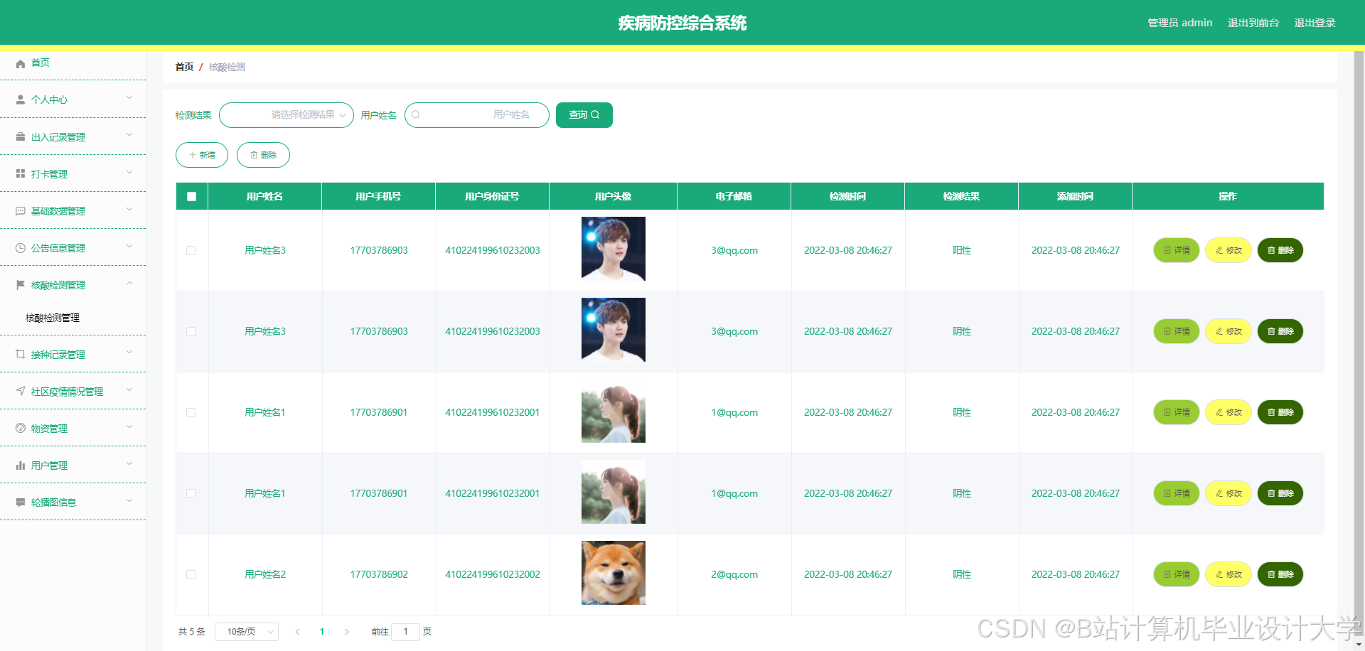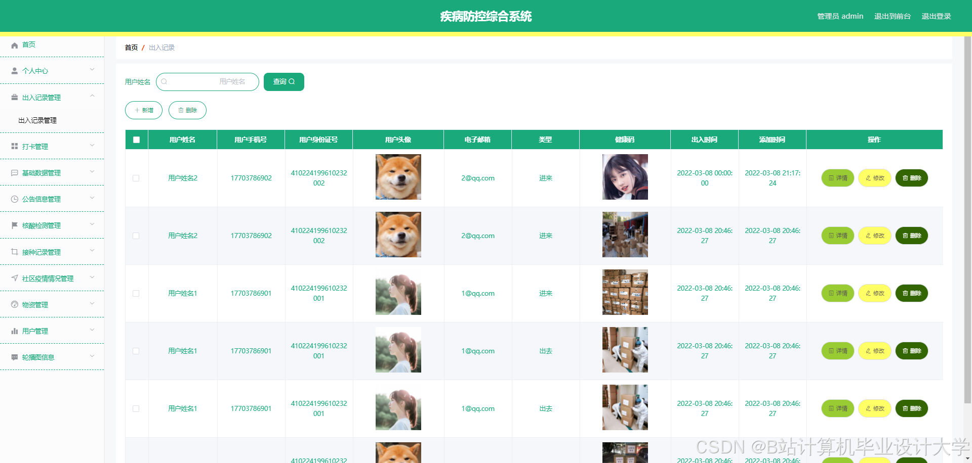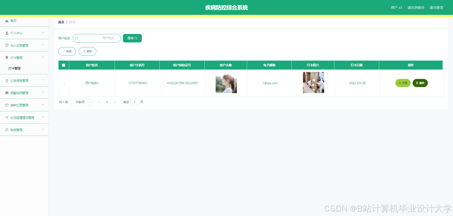 The comprehensive disease prevention and control system is developed through MySQL database and Spring Boot framework. The comprehensive disease prevention and control system can realize the functions of access record management, punch-in management, vaccination record management, nucleic acid detection management, community epidemic management, material application management, material management and other functions.