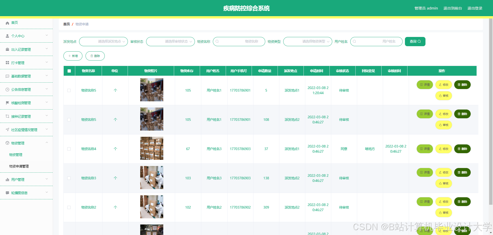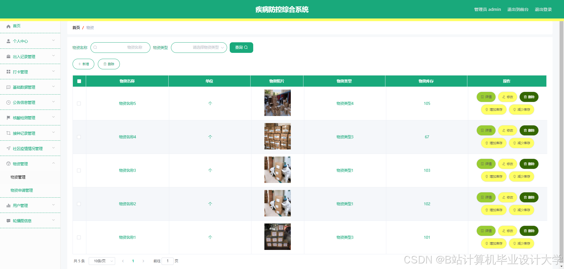 疾病防控综合系统通过MySQL数据库与Spring Boot框架进行开发,疾病防控综合系统能够实现出入记录管理,打卡管理,接种记录管理,核酸检测管理,社区疫情管理,物资申请管理,物资管理等功能。