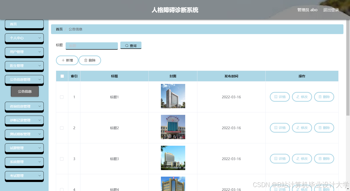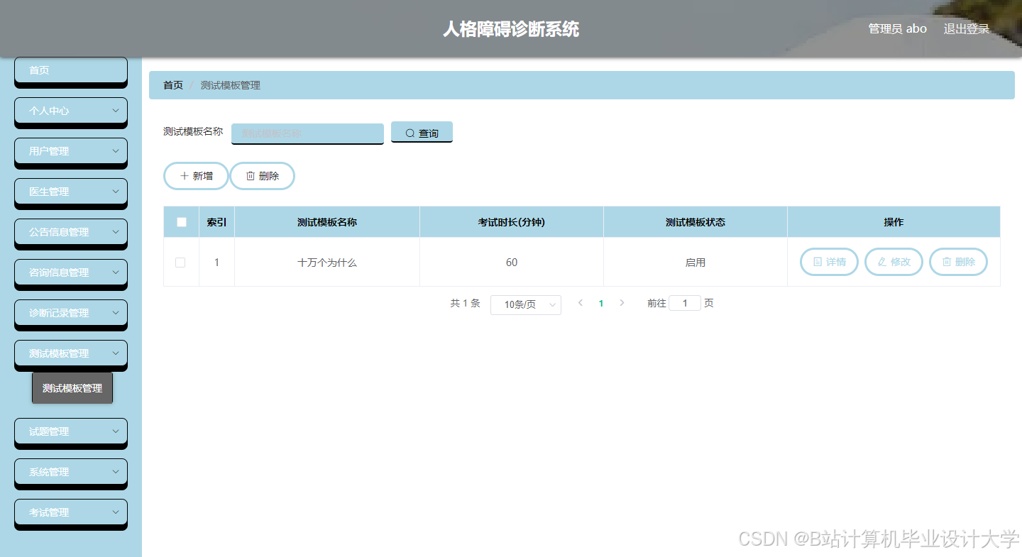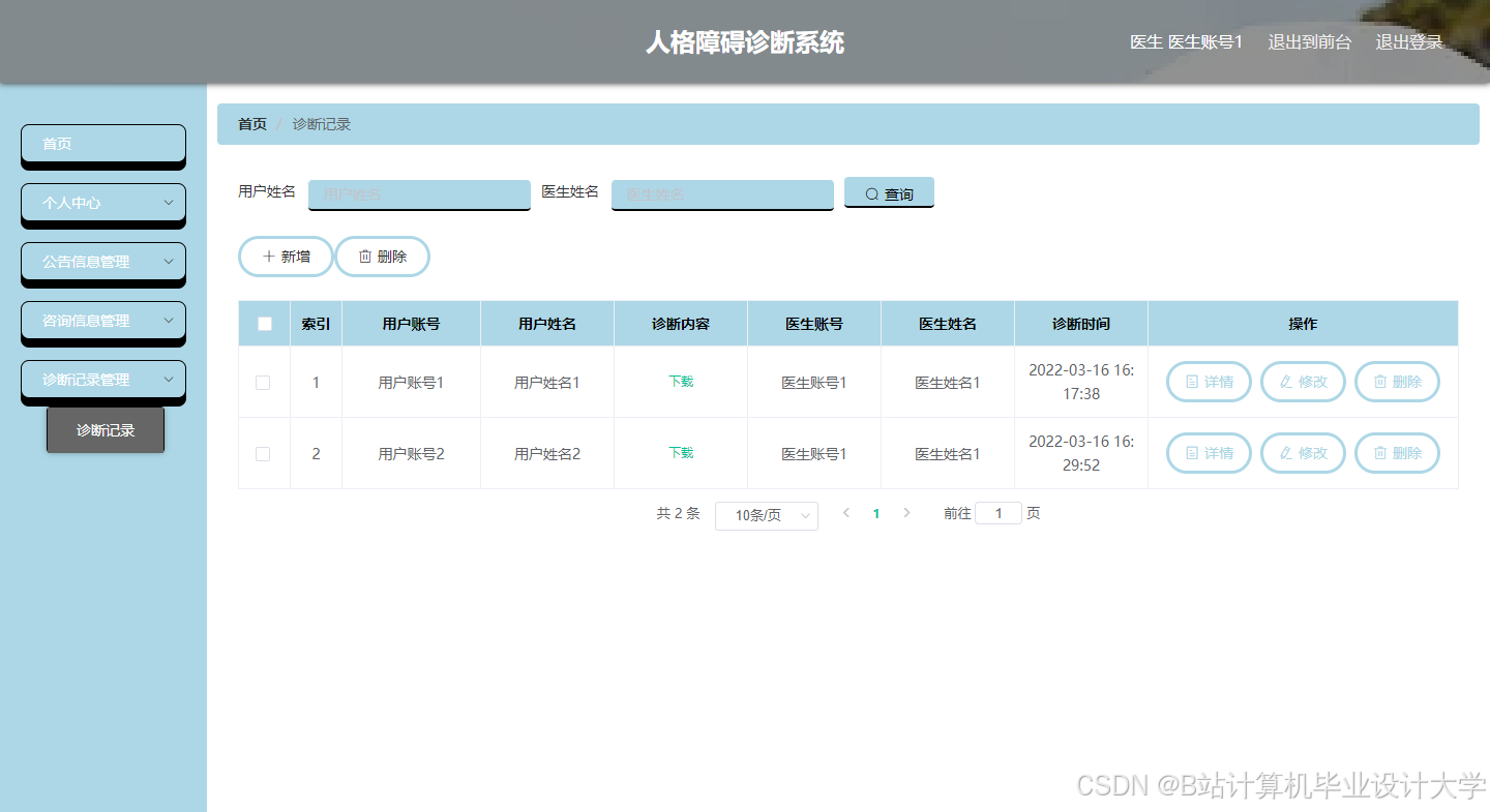 社会发展日新月异,用计算机应用实现数据管理功能已经算是很完善的了,但是随着移动互联网的到来,处理信息不再受制于地理位置的限制,处理信息及时高效,备受人们的喜爱。本次开发一套人格障碍诊断系统,有管理员,医生,用户三个角色。管理员可以管理所有,包含个人中心,用户管理,医生管理,公告信息管理,咨询信息管理,诊断记录管理,测试模板管理,试题管理,系统管理,考试管理等。医生和用户都可以注册登录,医生主要接待用户的咨询,并且管理自己参与的诊断记录。用户主要可以参考测试,咨询医生,查看自己的诊断记录等。人格障碍诊断系统服务端用Java开发,用Spring Boot框架开发的网站后台,数据库用到了MySQL数据库作为数据的存储。这样就让用户用着方便快捷,都通过同一个后台进行业务处理,而后台又可以根据并发量做好部署,用硬件和软件进行协作,满足于数据的交互式处理,让用户的数据存储更安全,得到数据更方便。
