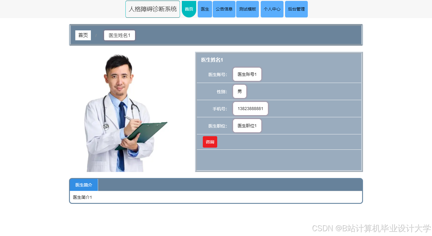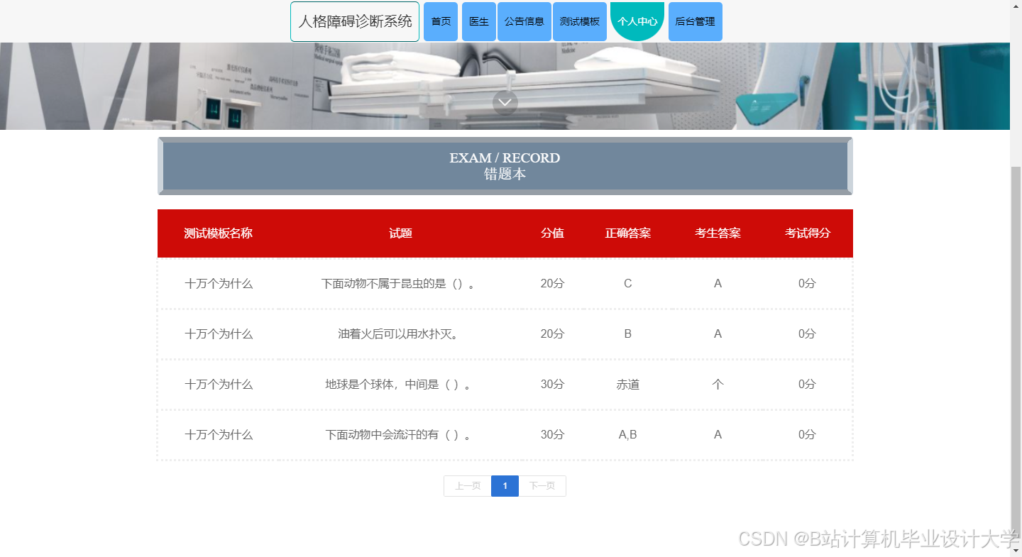互联网时代不仅仅是通过各种各样的电脑进行网络连接的时代,也包含了移动终端连接互联网进行复杂处理的一些事情。传统的互联网时代一般泛指就是PC端,也就是电脑互联网时代,但是最近几十年,是移动互联网时代,是向下一步互联网时代过度的一个重要时代,下一个互联网时代叫物联网,而移动互联网就是一个风口,是当前社会的主流风向。目前移动互联网大行其道,人人都手中拿着智能机,手机手机,手不离机,如果开发一个用在手机上的程序软件,那是多么的符合潮流,符合管理者和客户的理想。本次就是开发人格障碍诊断系统,有管理员,医生,用户三个角色。管理员可以管理所有,包含个人中心,用户管理,医生管理,公告信息管理,咨询信息管理,诊断记录管理,测试模板管理,试题管理,系统管理,考试管理等。医生和用户都可以注册登录,医生主要接待用户的咨询,并且管理自己参与的诊断记录。用户主要可以参考测试,咨询医生,查看自己的诊断记录等。