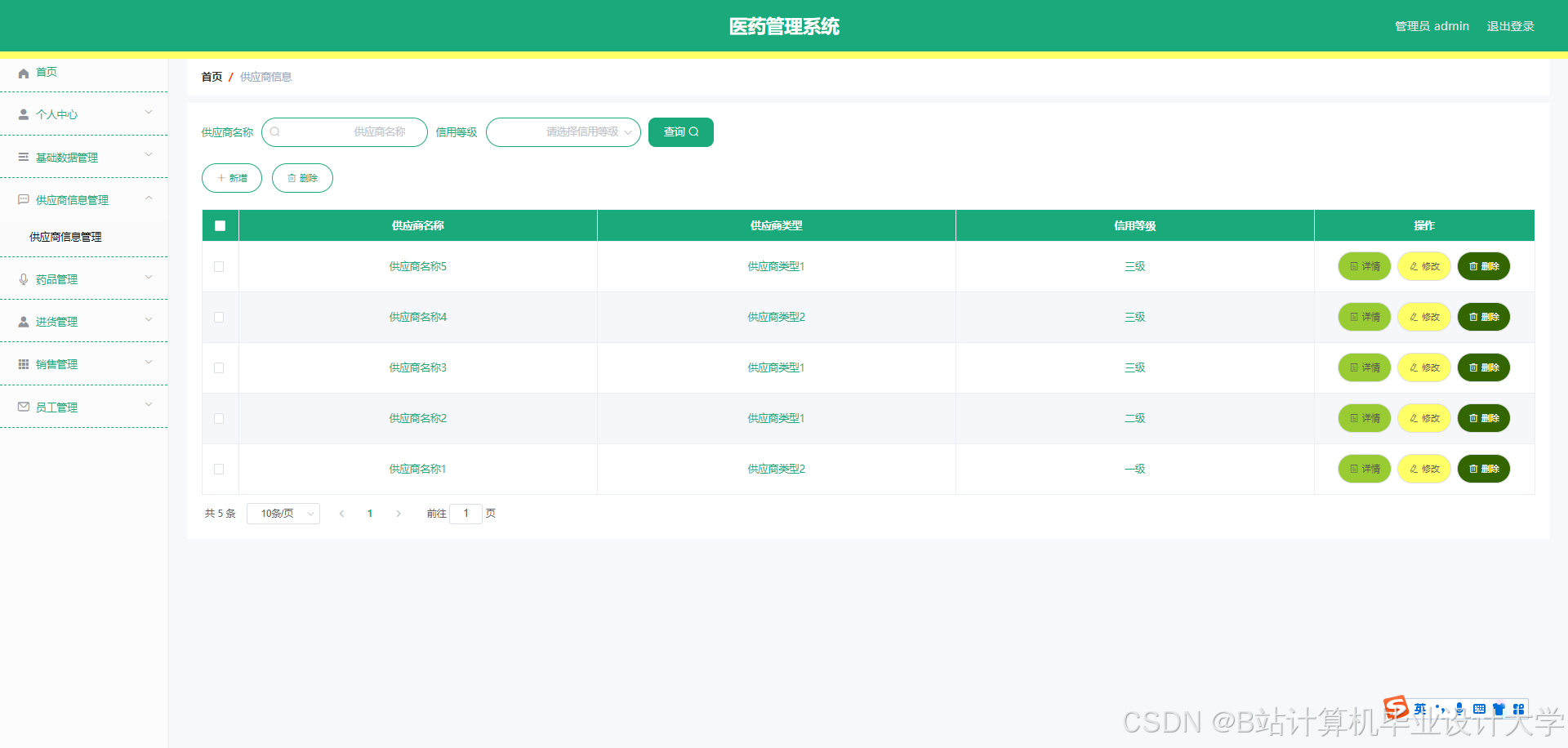 The data management tool of the medical management system is MySQL, the coding language is Java, and the framework used is the Spring Boot framework. The system can realize supplier type management, supplier credit rating management, drug type management, supplier management, drug management, purchase management, sales management and other functions.