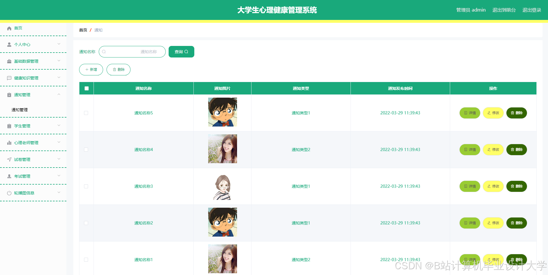 本大学生心理健康管理系统分为管理员还有用户两个权限,管理员可以管理用户的基本信息内容,可以管理通知信息以及通知的租赁信息,能够与用户进行相互交流等操作,用户可以查看试卷信息,可以查看通知以及查看管理员回复信息等操作。