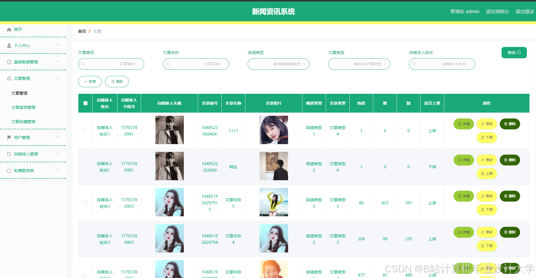 信息数据从传统到当代,是一直在变革当中,突如其来的互联网让传统的信息管理看到了革命性的曙光,因为传统信息管理从时效性,还是安全性,还是可操作性等各个方面来讲,遇到了互联网时代才发现能补上自古以来的短板,有效的提升管理的效率和业务水平。传统的管理模式,时间越久管理的内容越多,也需要更多的人来对数据进行整理,并且数据的汇总查询方面效率也是极其的低下,并且数据安全方面永远不会保证安全性能。结合数据内容管理的种种缺点,在互联网时代都可以得到有效的补充。结合先进的互联网技术,开发符合需求的软件,让数据内容管理不管是从录入的及时性,查看的及时性还是汇总分析的及时性,都能让正确率达到最高,管理更加的科学和便捷。本次开发的新闻资讯系统实现了字典管理、文章管理、文章收藏管理、文章留言管理、用户管理、自媒体人管理、管理员管理等功能。系统用到了关系型数据库中王者MySql作为系统的数据库,有效的对数据进行安全的存储,有效的备份,对数据可靠性方面得到了保证。并且程序也具备程序需求的所有功能,使得操作性还是安全性都大大提高,让新闻资讯系统更能从理念走到现实,确确实实的让人们提升信息处理效率。