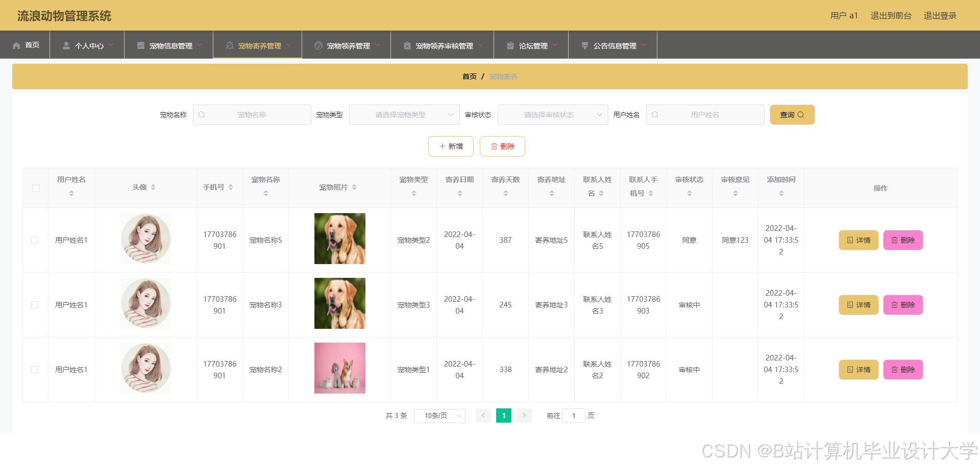 关键词:流浪动物管理系统;宠物寄养;宠物领养