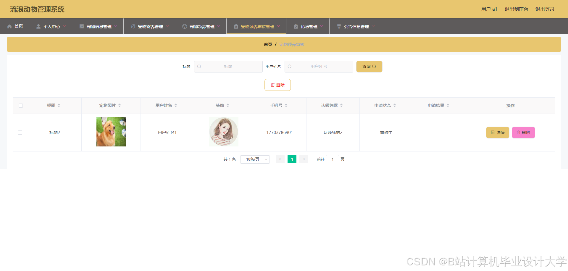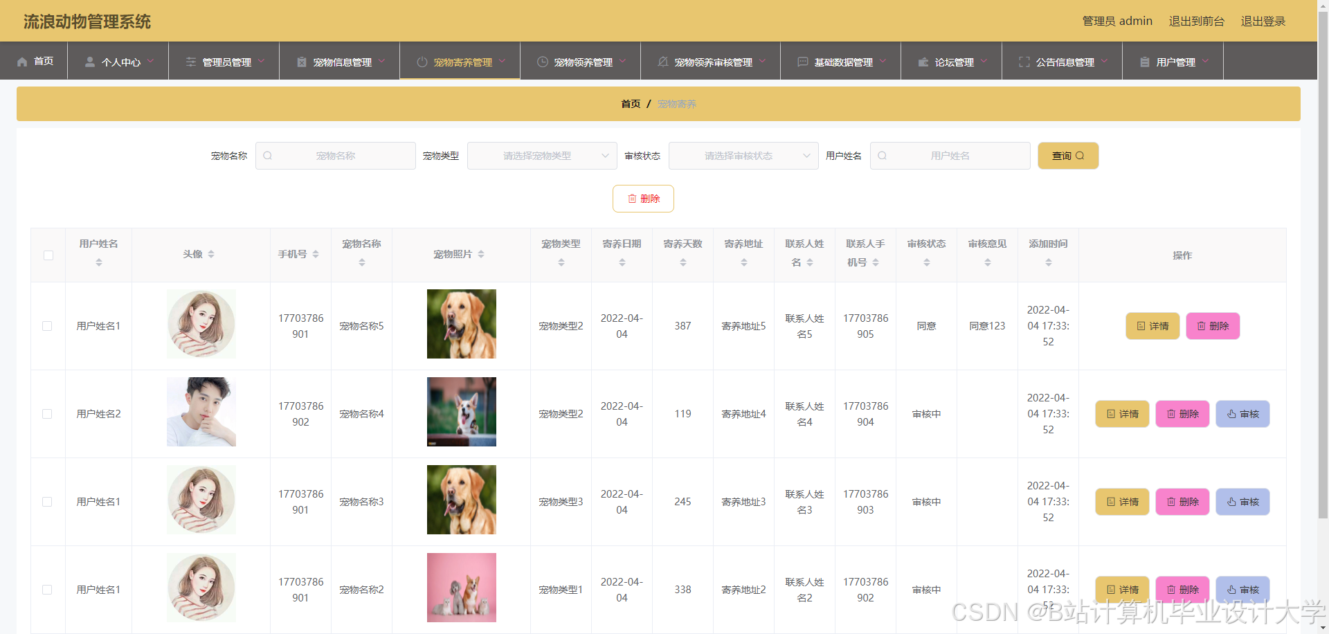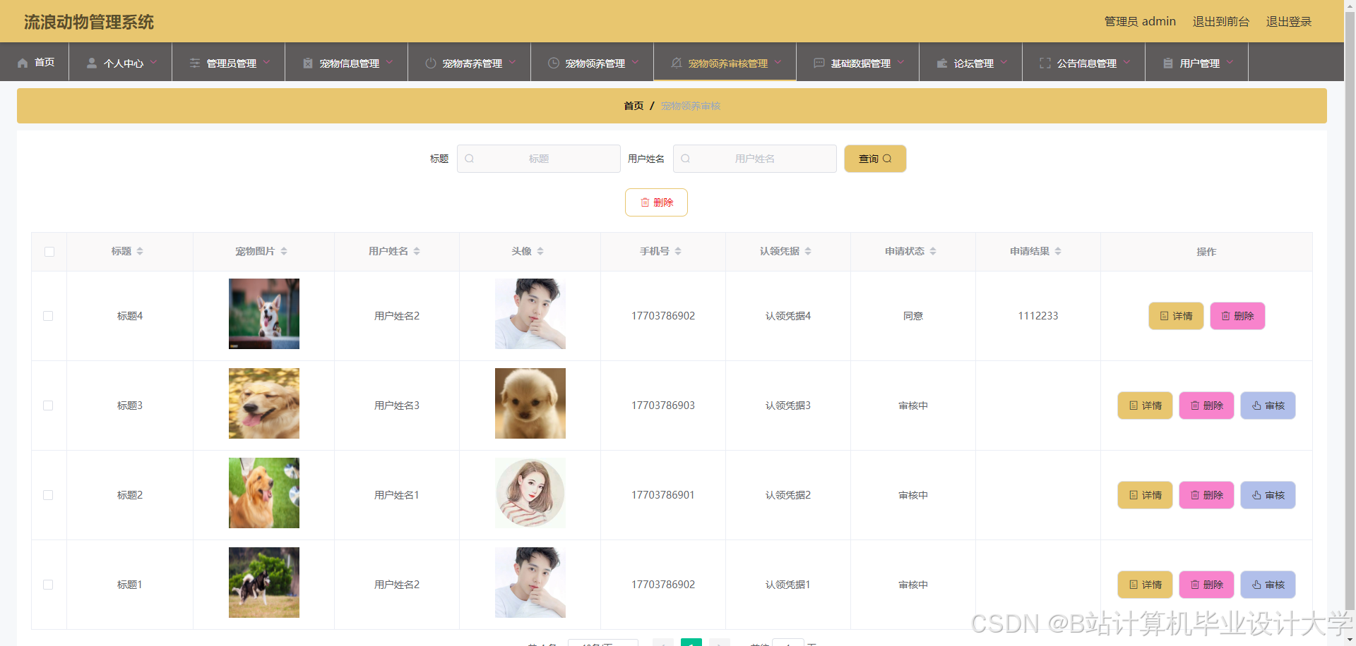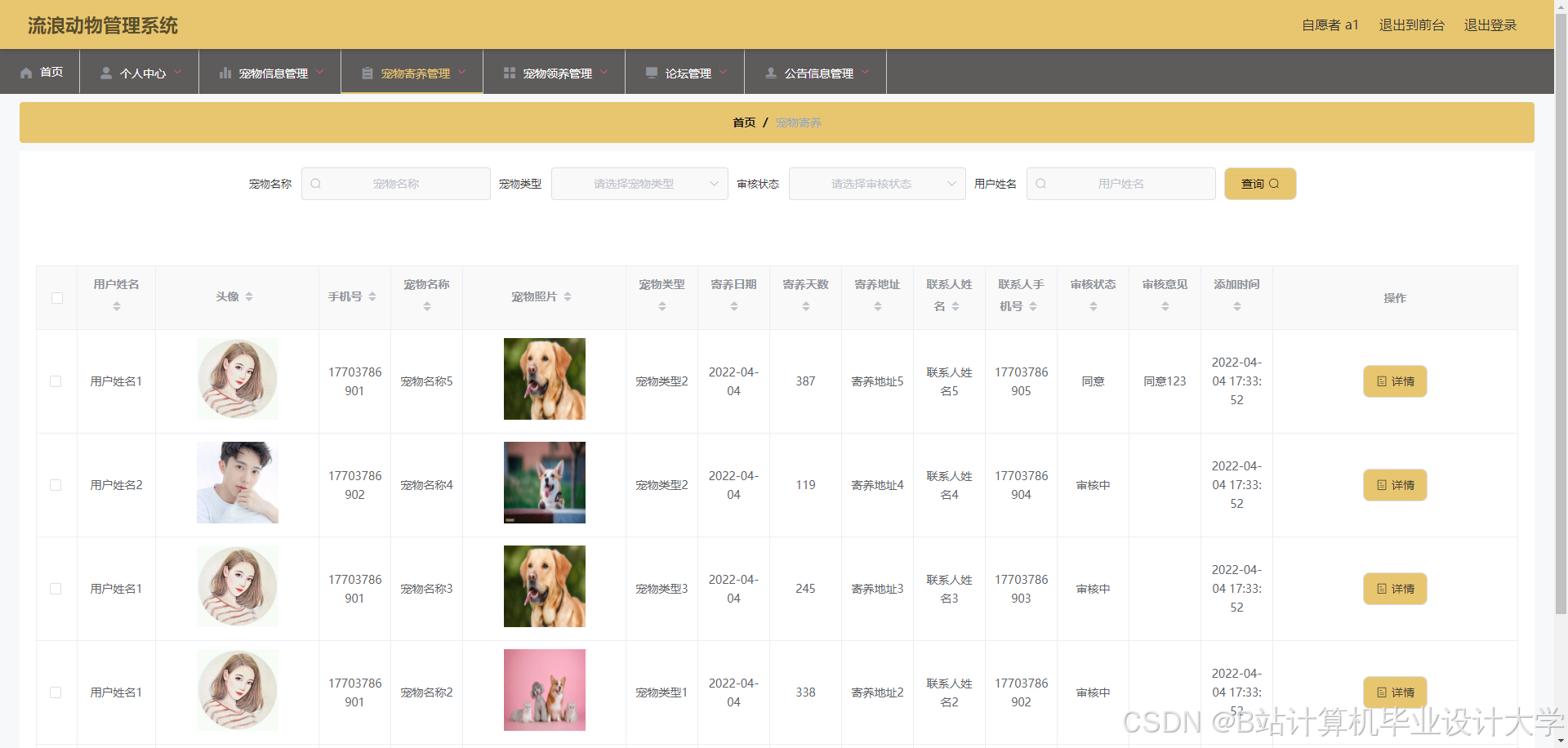 The stray animal management system is developed through MySQL database and Spring Boot framework. The stray animal management system can realize pet information management, pet message management, pet collection management, pet foster management, pet adoption management, pet adoption audit management and other functions.
