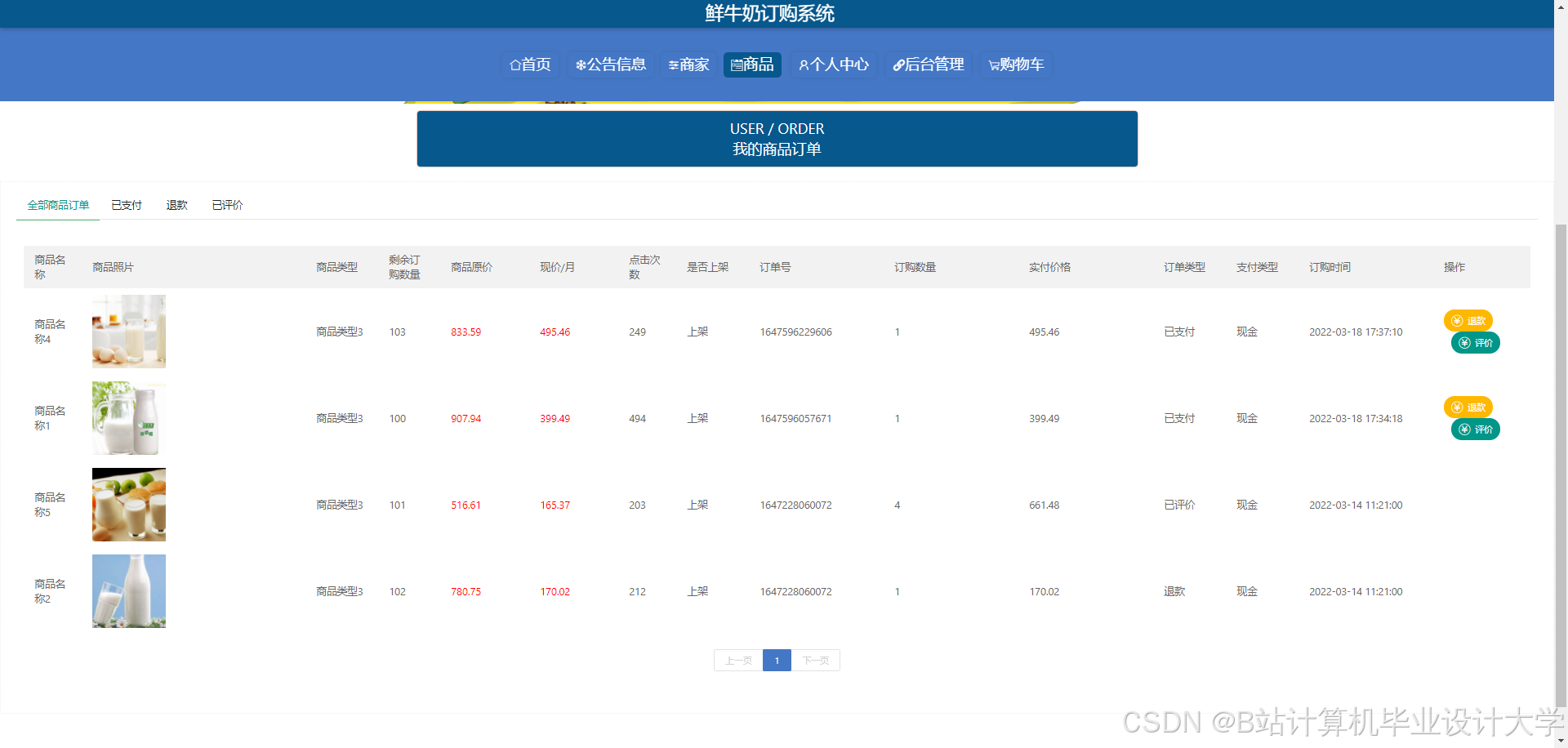 The fresh milk ordering system can realize business management, commodity order management, user management, commodity management, commodity evaluation management and other functions. The system uses Mysql database, Java language, Spring Boot framework and other technologies for programming.