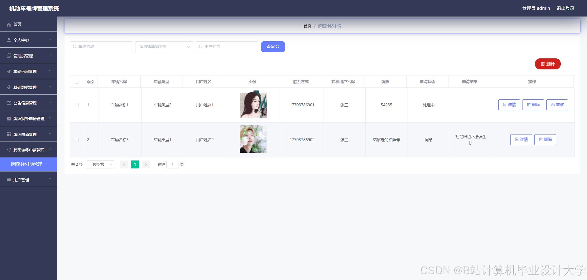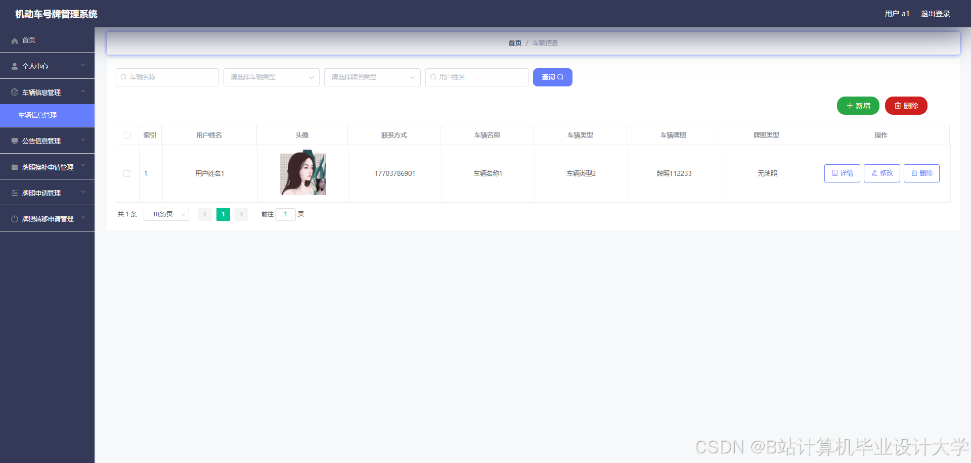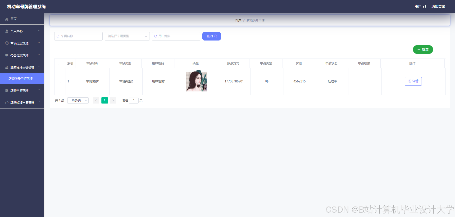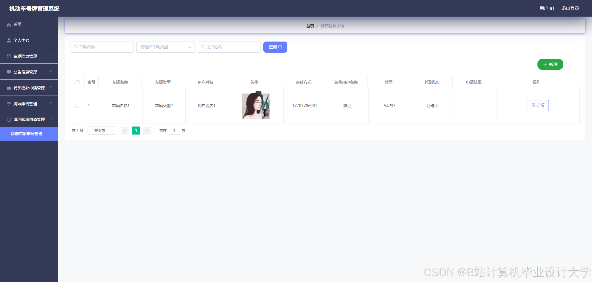 The motor vehicle license plate management system is developed through MySQL database and Spring Boot framework. The motor vehicle license plate management system can realize license renewal application management, user management, license application management, license transfer application management, vehicle information management, announcement information management, etc. Function.