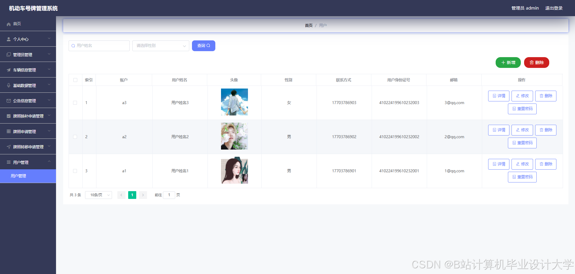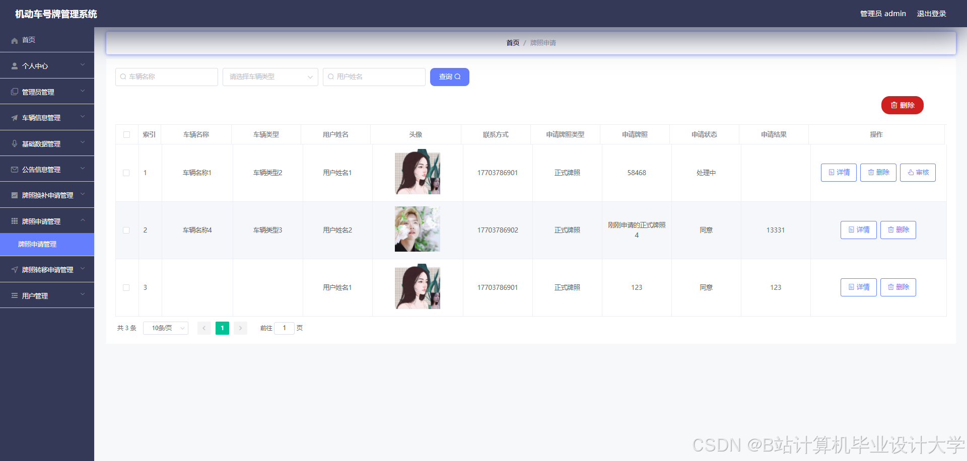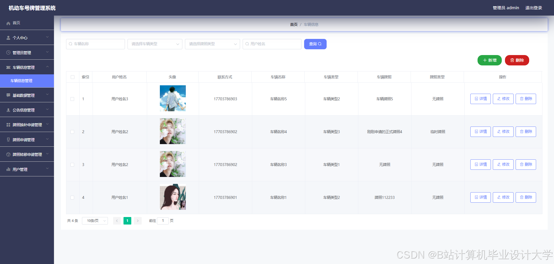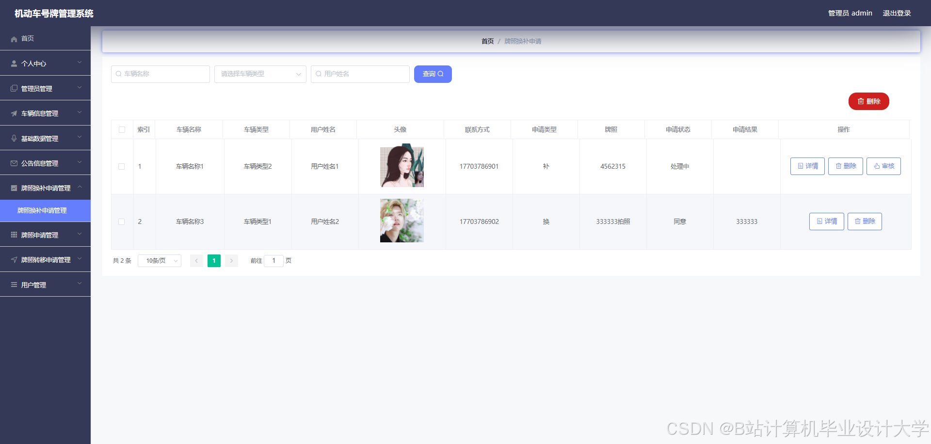 The motor vehicle license plate management system is developed through MySQL database and Spring Boot framework. The motor vehicle license plate management system can realize license renewal application management, user management, license application management, license transfer application management, vehicle information management, announcement information management, etc. Function.