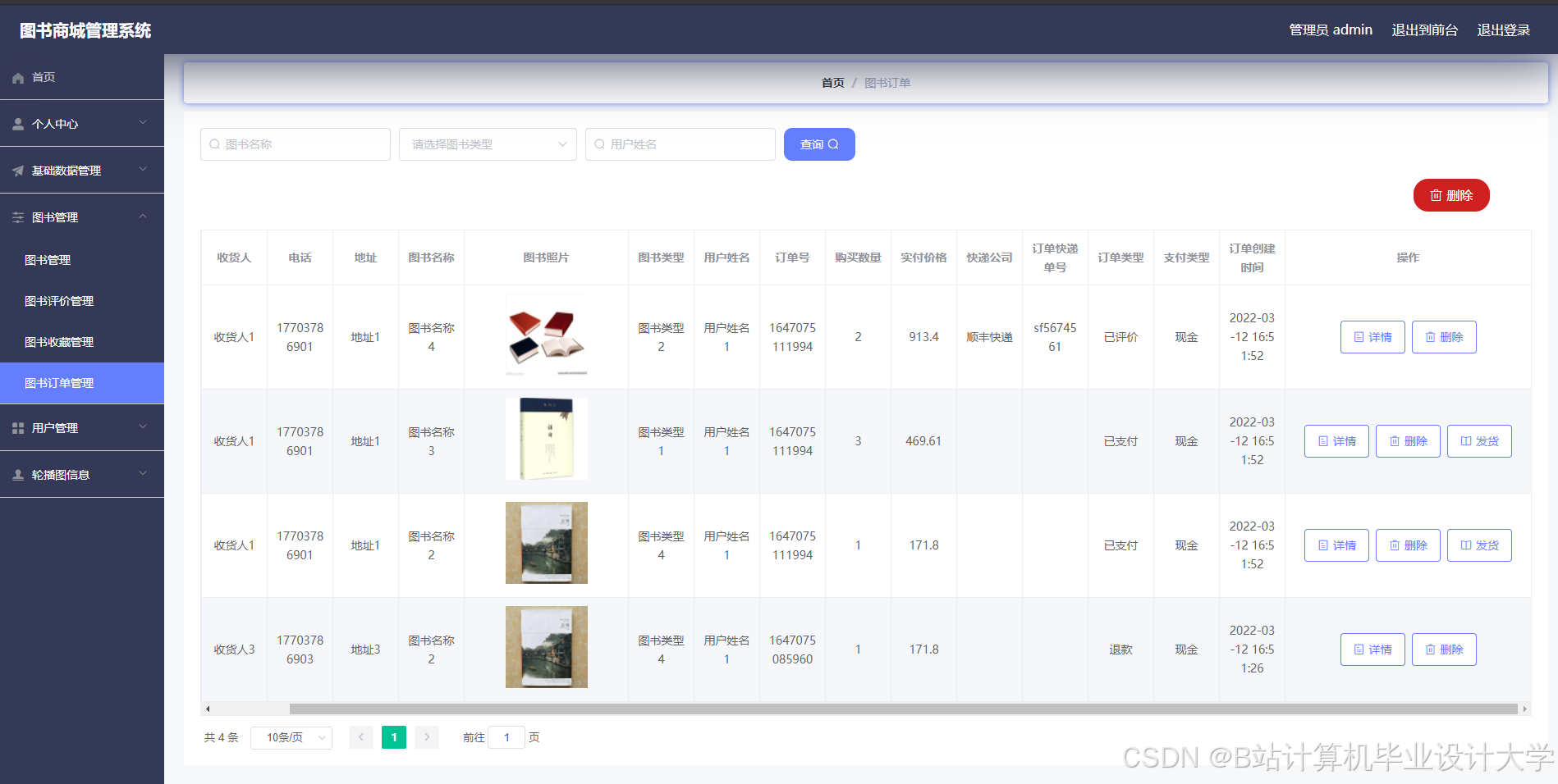 现代经济快节奏发展以及不断完善升级的信息化技术,让传统数据信息的管理升级为软件存储,归纳,集中处理数据信息的管理方式。本图书商城管理系统就是在这样的大环境下诞生,其可以帮助管理者在短时间内处理完毕庞大的数据信息,使用这种软件工具可以帮助管理人员提高事务处理效率,达到事半功倍的效果。此图书商城管理系统利用当下成熟完善的SSM框架,使用跨平台的可开发大型商业网站的Java语言,以及最受欢迎的RDBMS应用软件之一的Mysql数据库进行程序开发。实现了用户在线选择试题并完成答题,在线查看考核分数。管理员管理收货地址管理、购物车管理、字典管理、图书管理、图书收藏管理、图书评价管理、图书订单管理、用户管理、管理员管理等功能。图书商城管理系统的开发根据操作人员需要设计的界面简洁美观,在功能模块布局上跟同类型网站保持一致,程序在实现基本要求功能时,也为数据信息面临的安全问题提供了一些实用的解决方案。可以说该程序在帮助管理者高效率地处理工作事务的同时,也实现了数据信息的整体化,规范化与自动化。