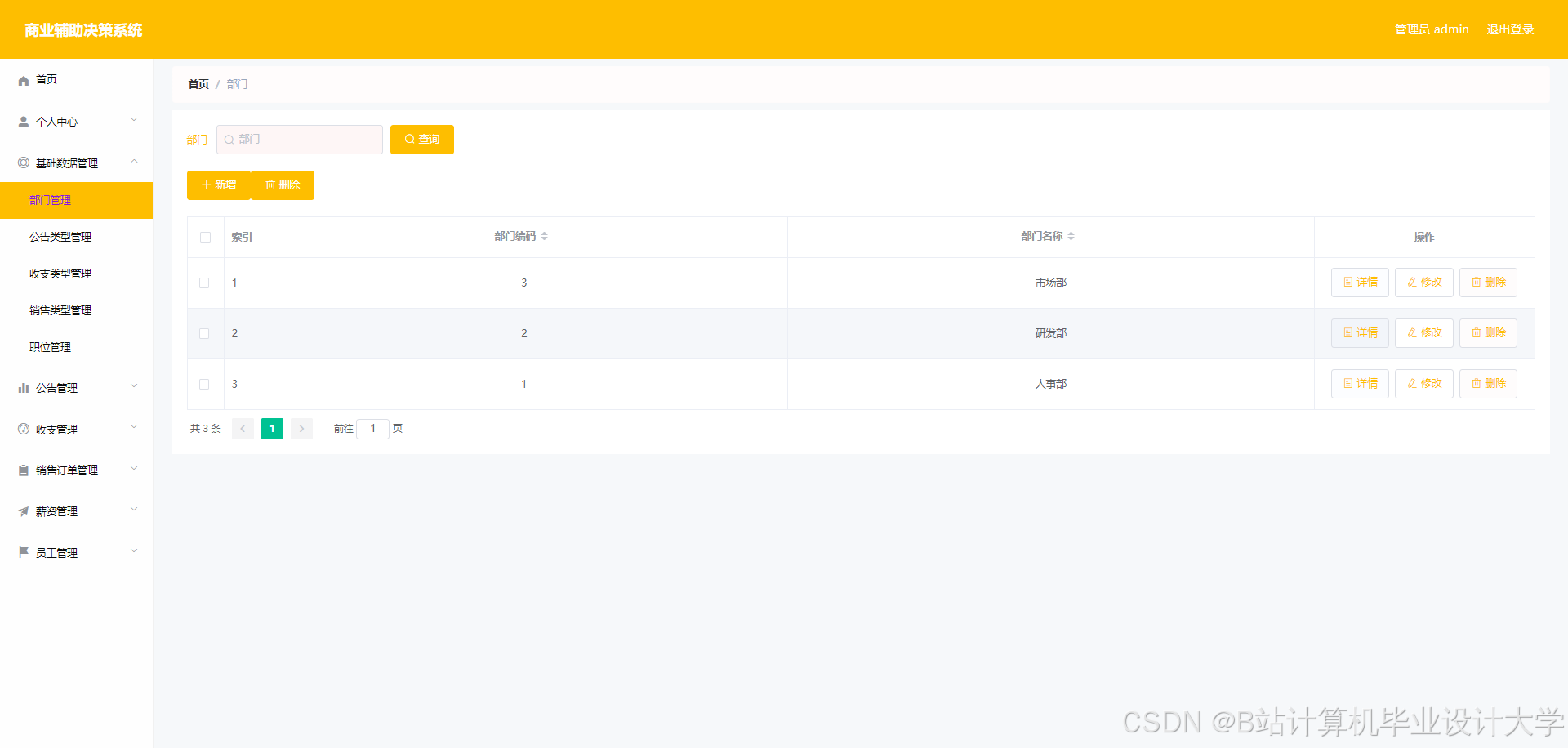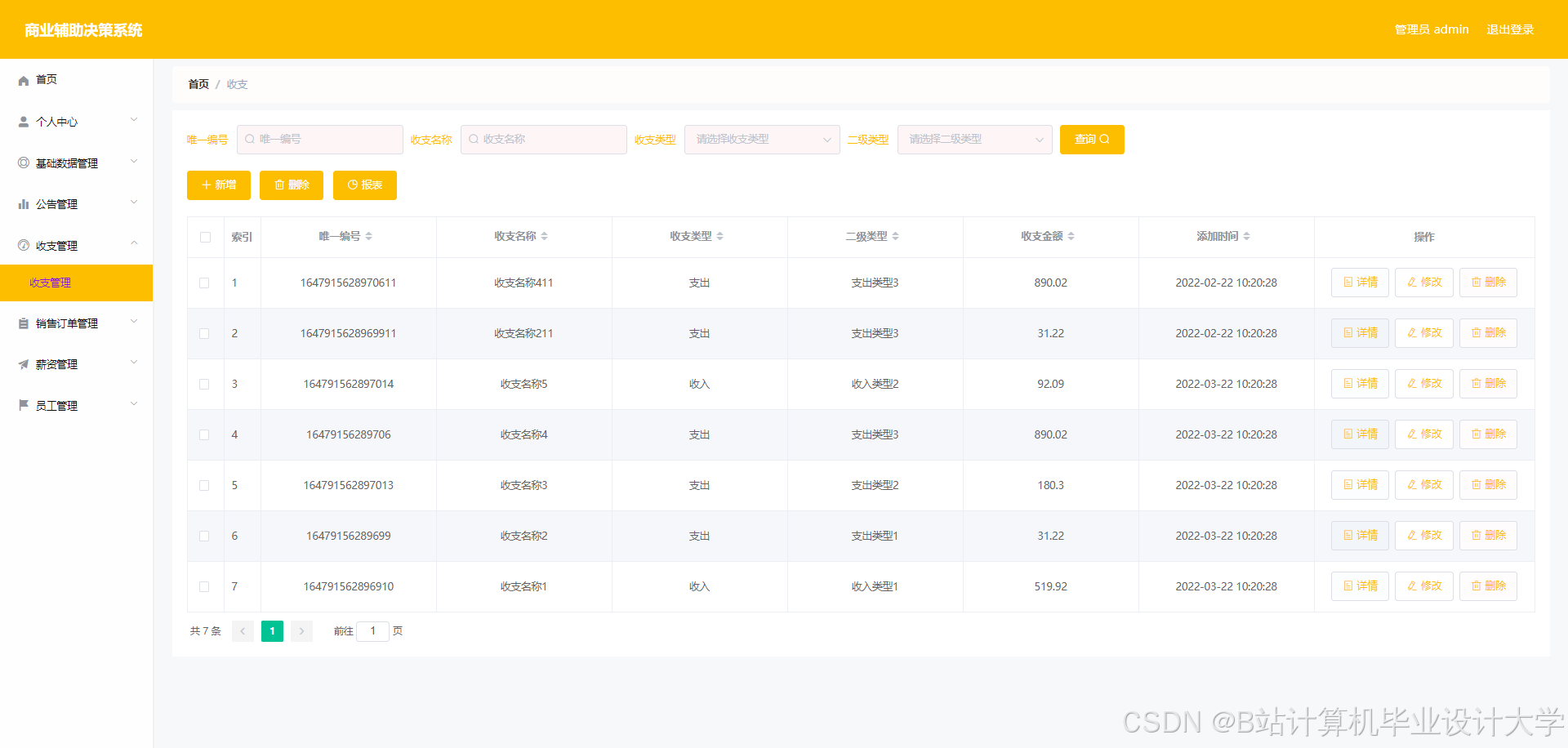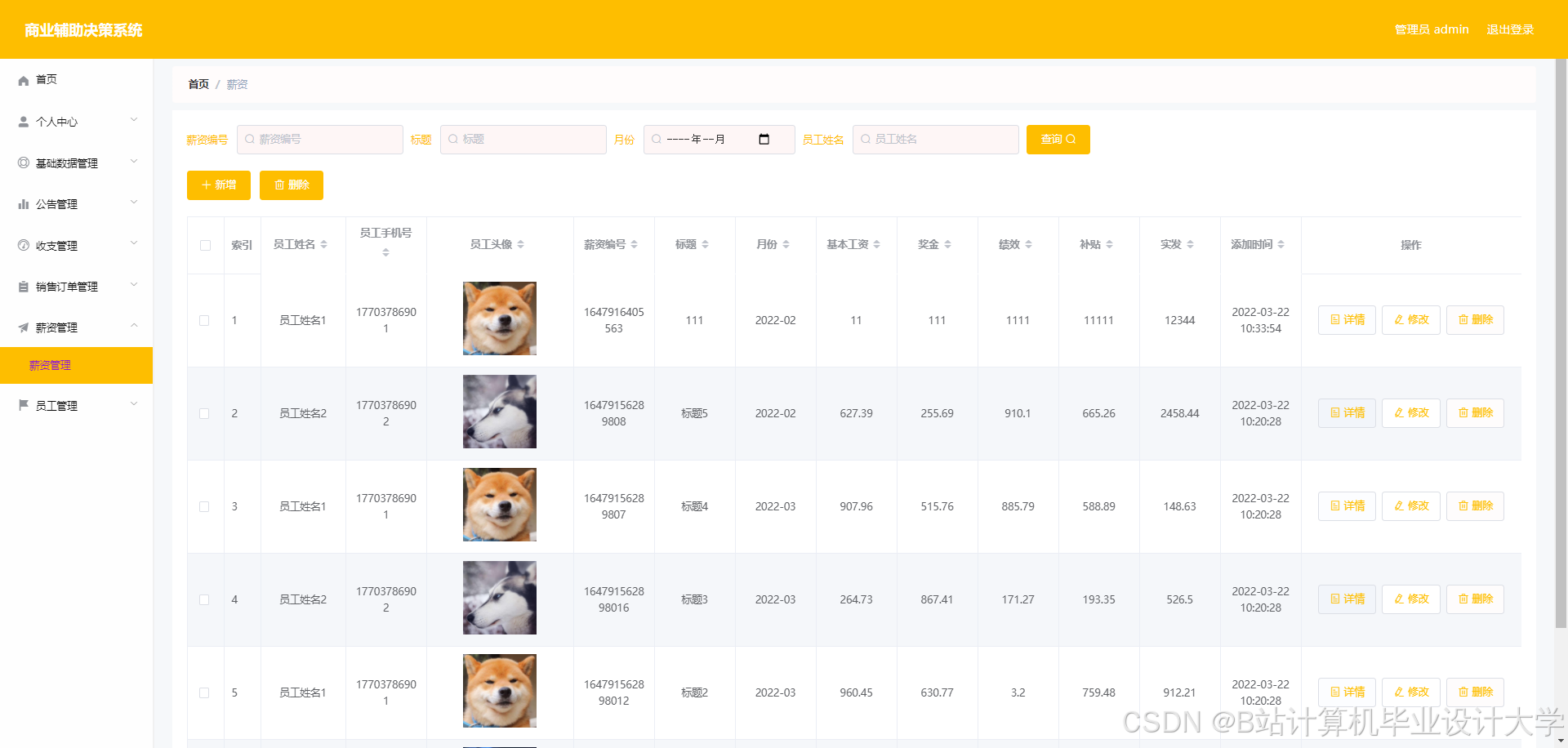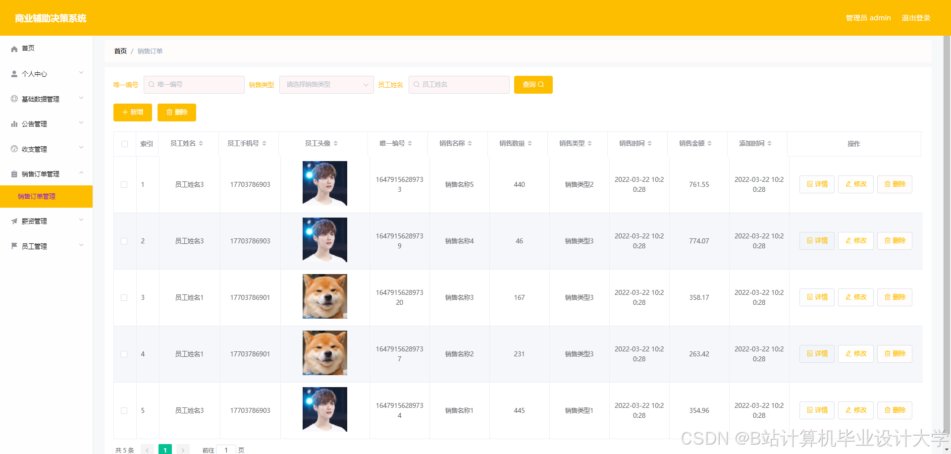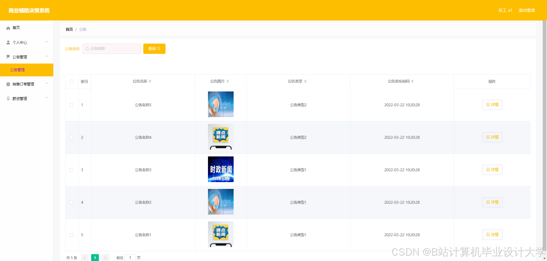 The functions implemented by the commercial decision-making system include income information management and expenditure information management, employee sales order information management, employee salary management, employee management, announcement management and other functions. The system uses Mysql database, Java language, Spring Boot framework and other technologies for programming.