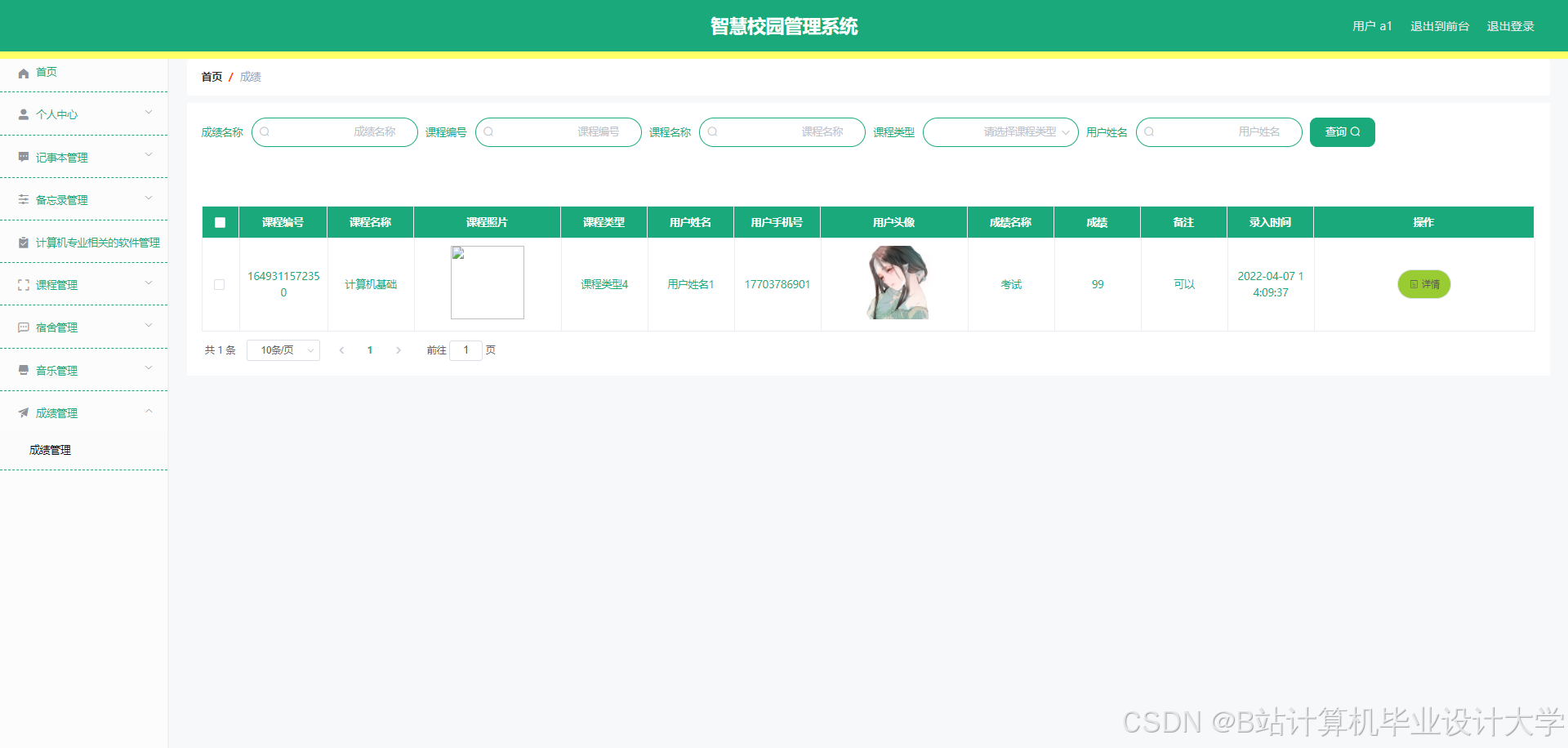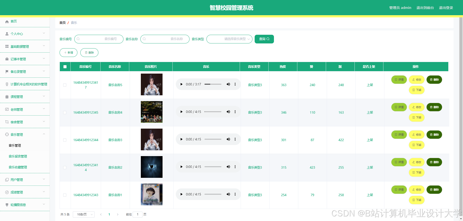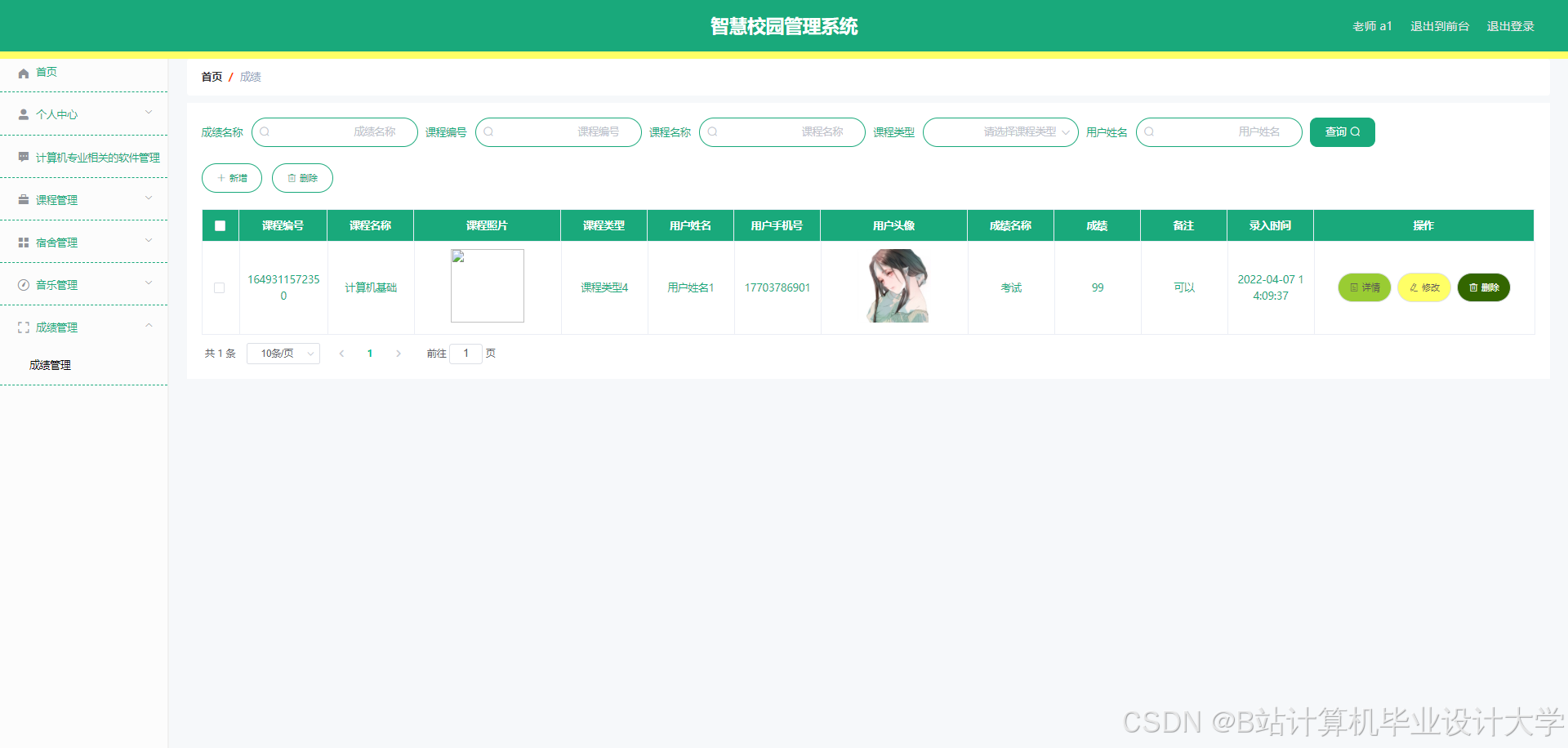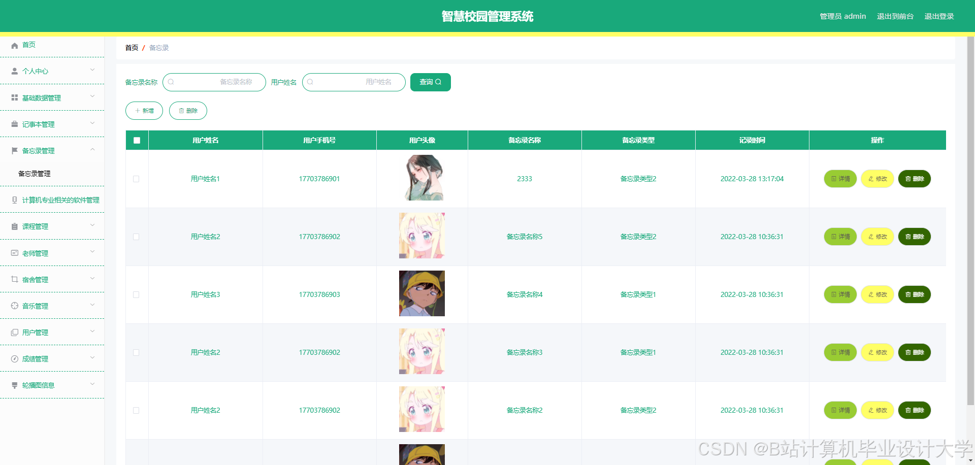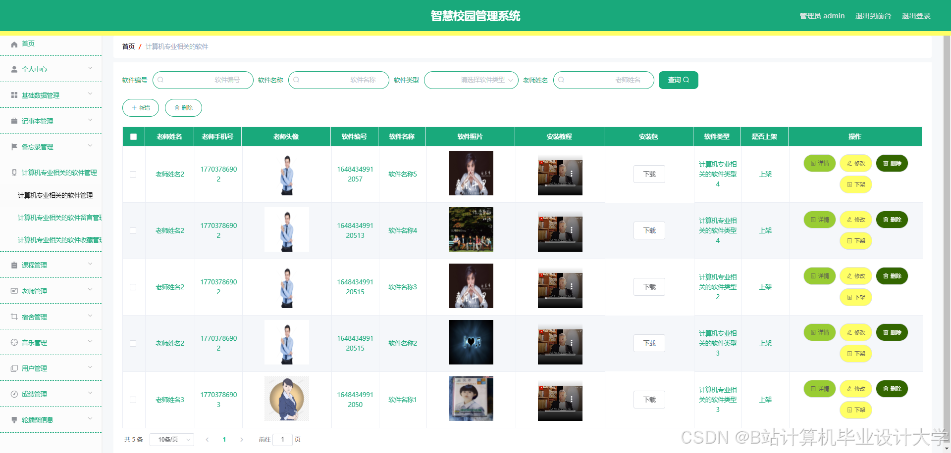 The smart campus management system can realize notepad management, memorandum management, software management, software message management, software collection management, course management, course message management, course collection management, teacher management, dormitory management, dormitory personnel management, dormitory return management, Dormitory repair management, music management, music message management, music collection management, user management, performance management and other functions. The system uses Mysql database, Java language, Spring Boot framework and other technologies for programming.