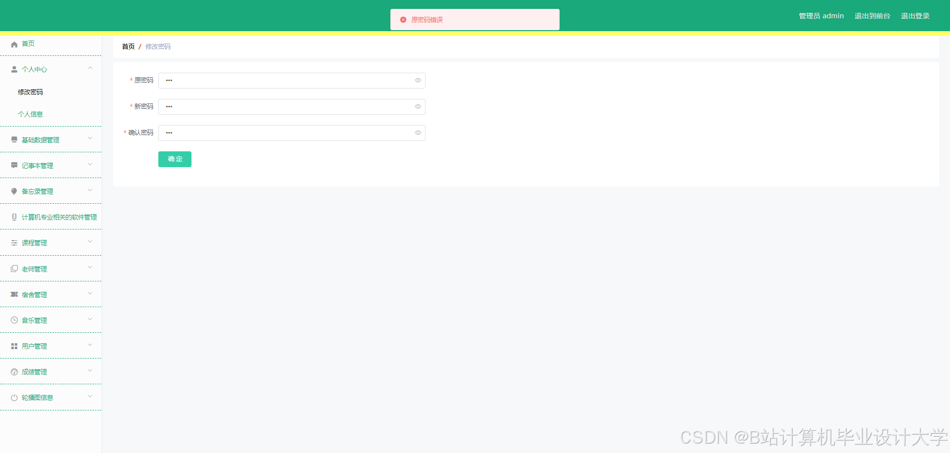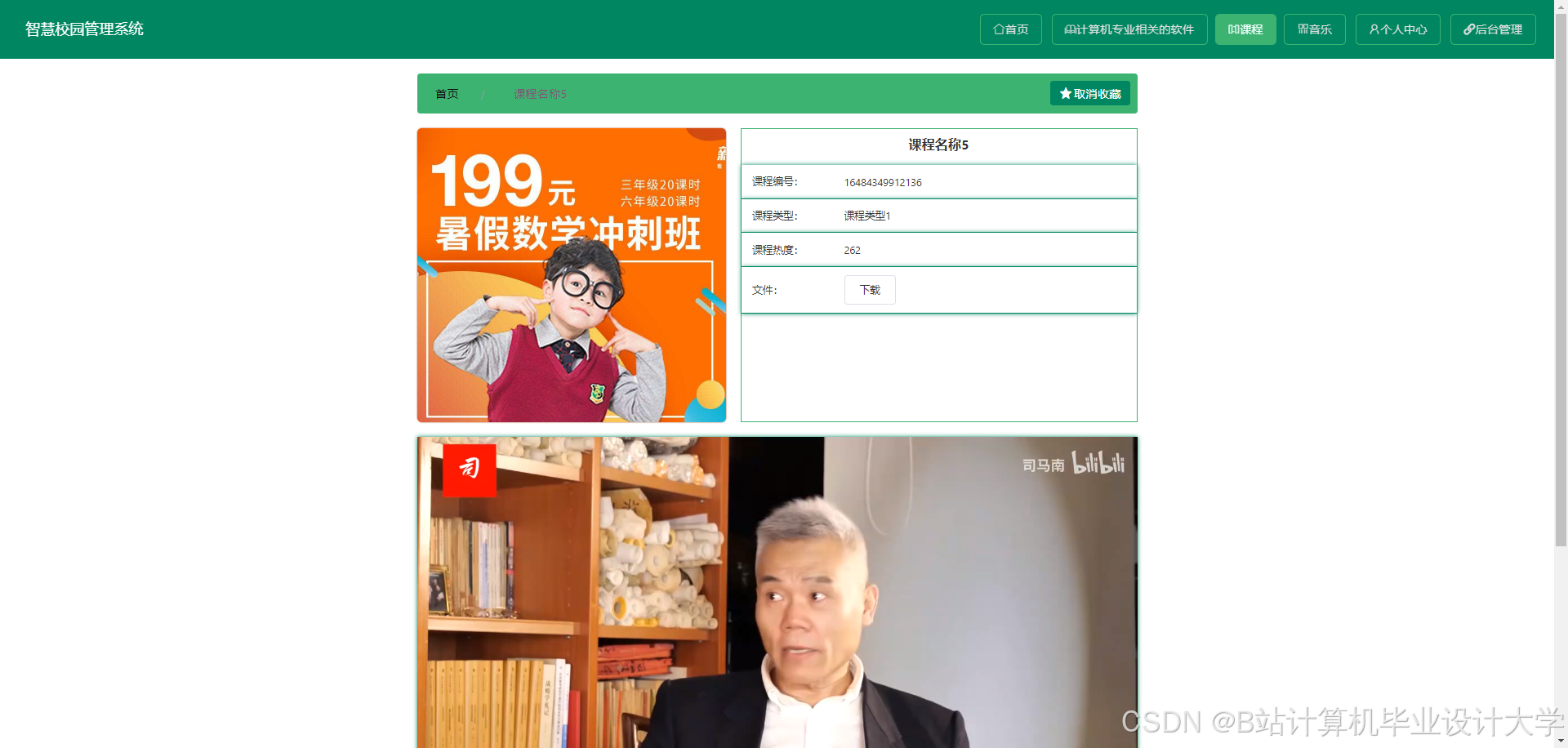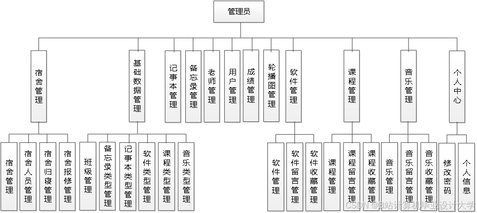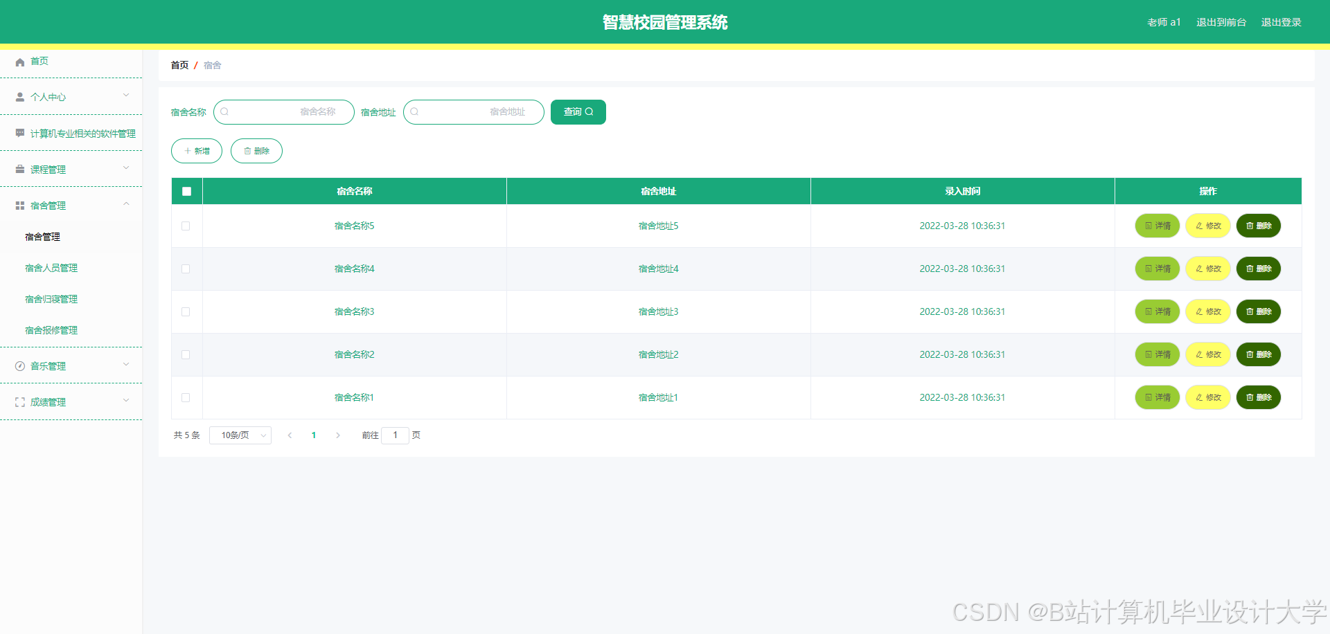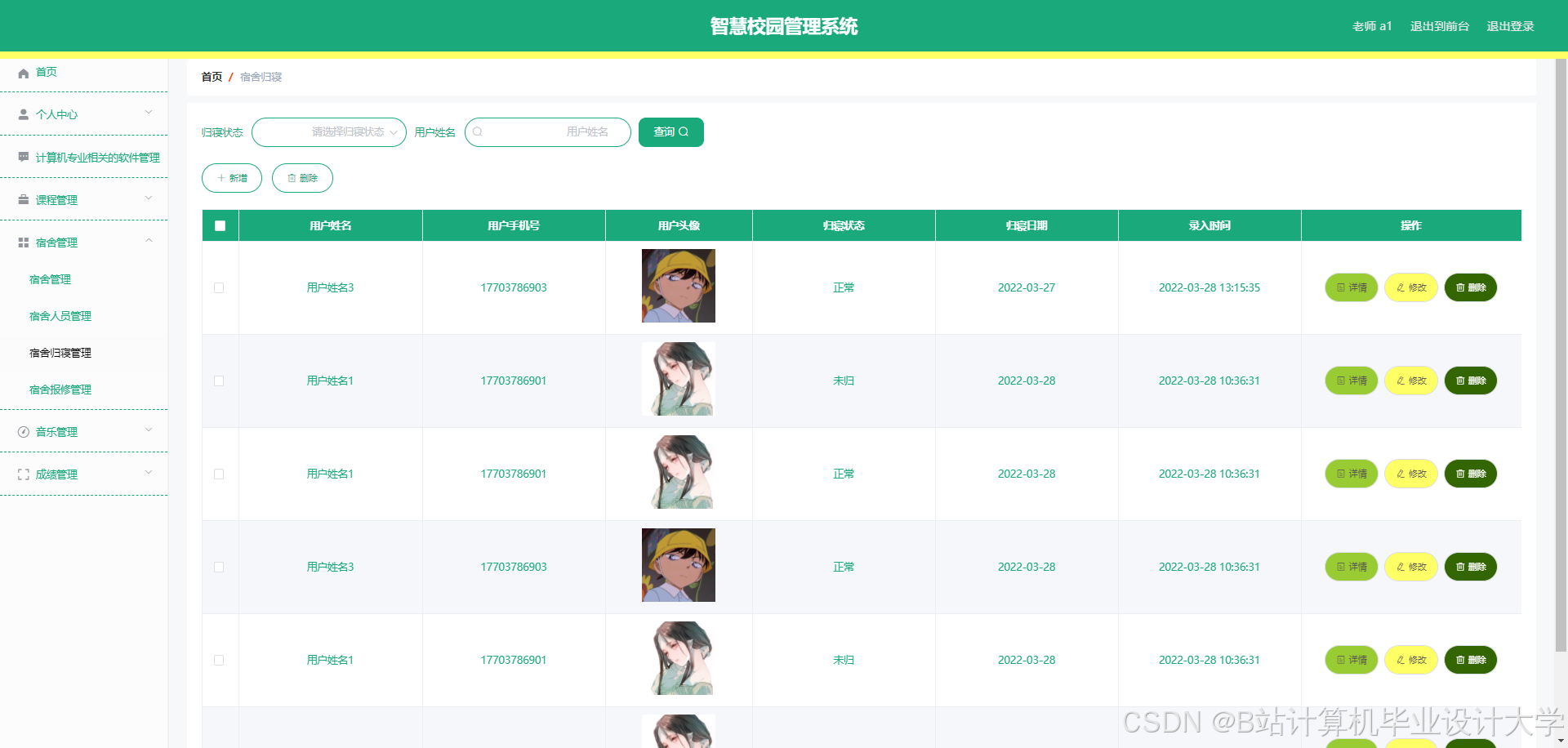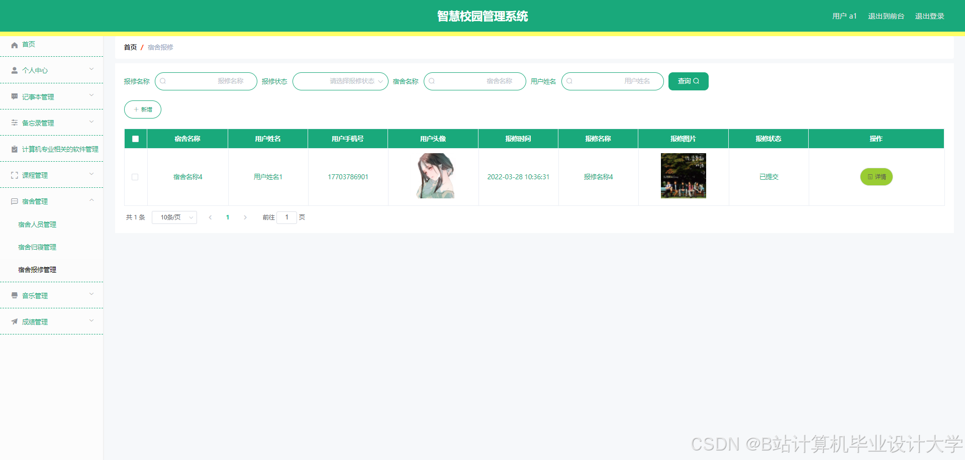The smart campus management system can realize notepad management, memorandum management, software management, software message management, software collection management, course management, course message management, course collection management, teacher management, dormitory management, dormitory personnel management, dormitory return management, Dormitory repair management, music management, music message management, music collection management, user management, performance management and other functions. The system uses Mysql database, Java language, Spring Boot framework and other technologies for programming.